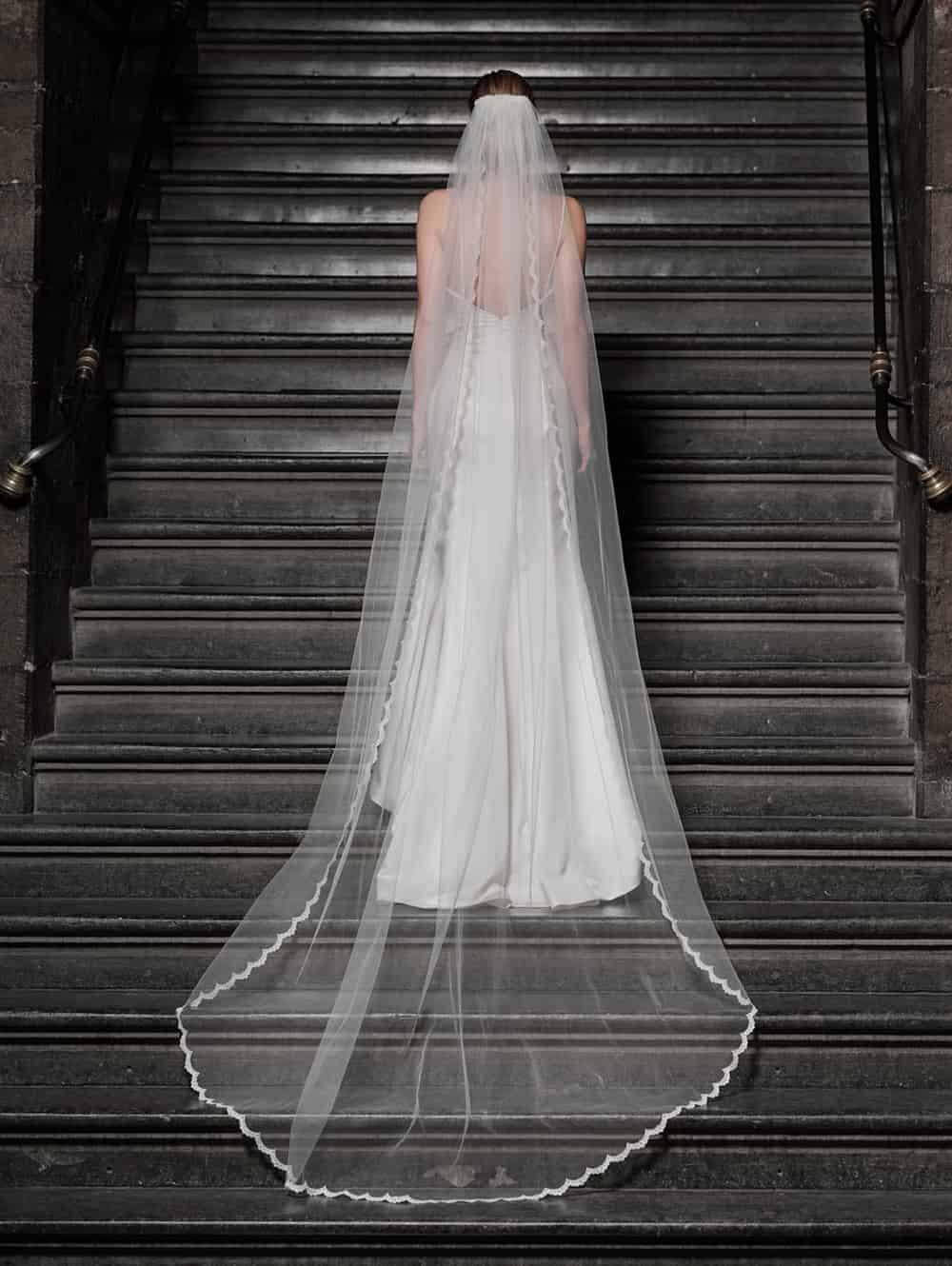 Enkellaags sluier van het merk Poirier. Deze sluier is 280 cm lang en heeft een geschulpte kanten rand versierd met kleine pareltjes.