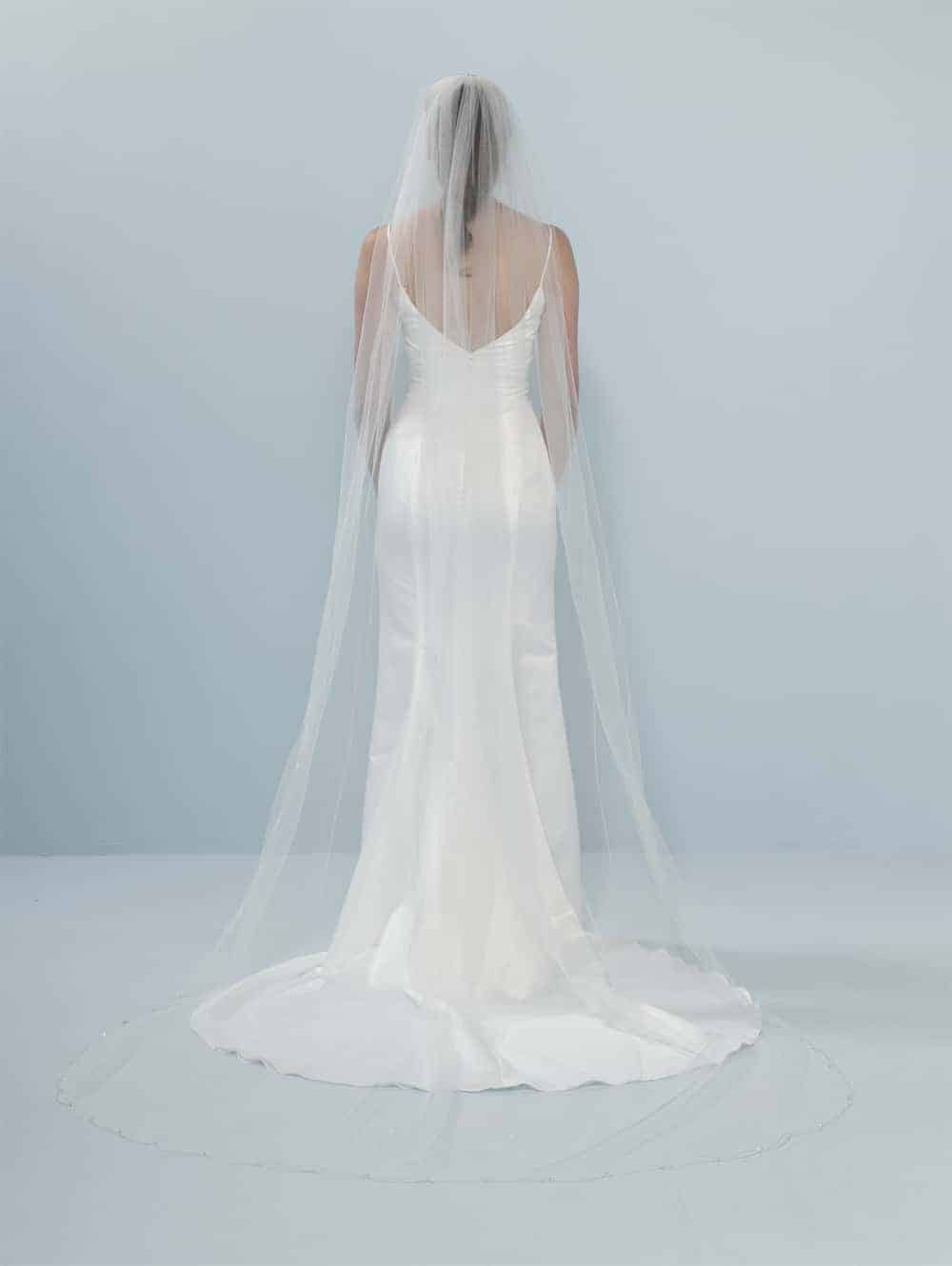 Wil jij een subtiele bruidslook? Kies dan voor deze ivoorkleurige soft-tule sluier S224-280 met een versiering van delicaat borduursel van zilverdraad in golfvorm. De sluier is ook versierd met kristallen en pailletjes en heeft een lengte van 280 cm.