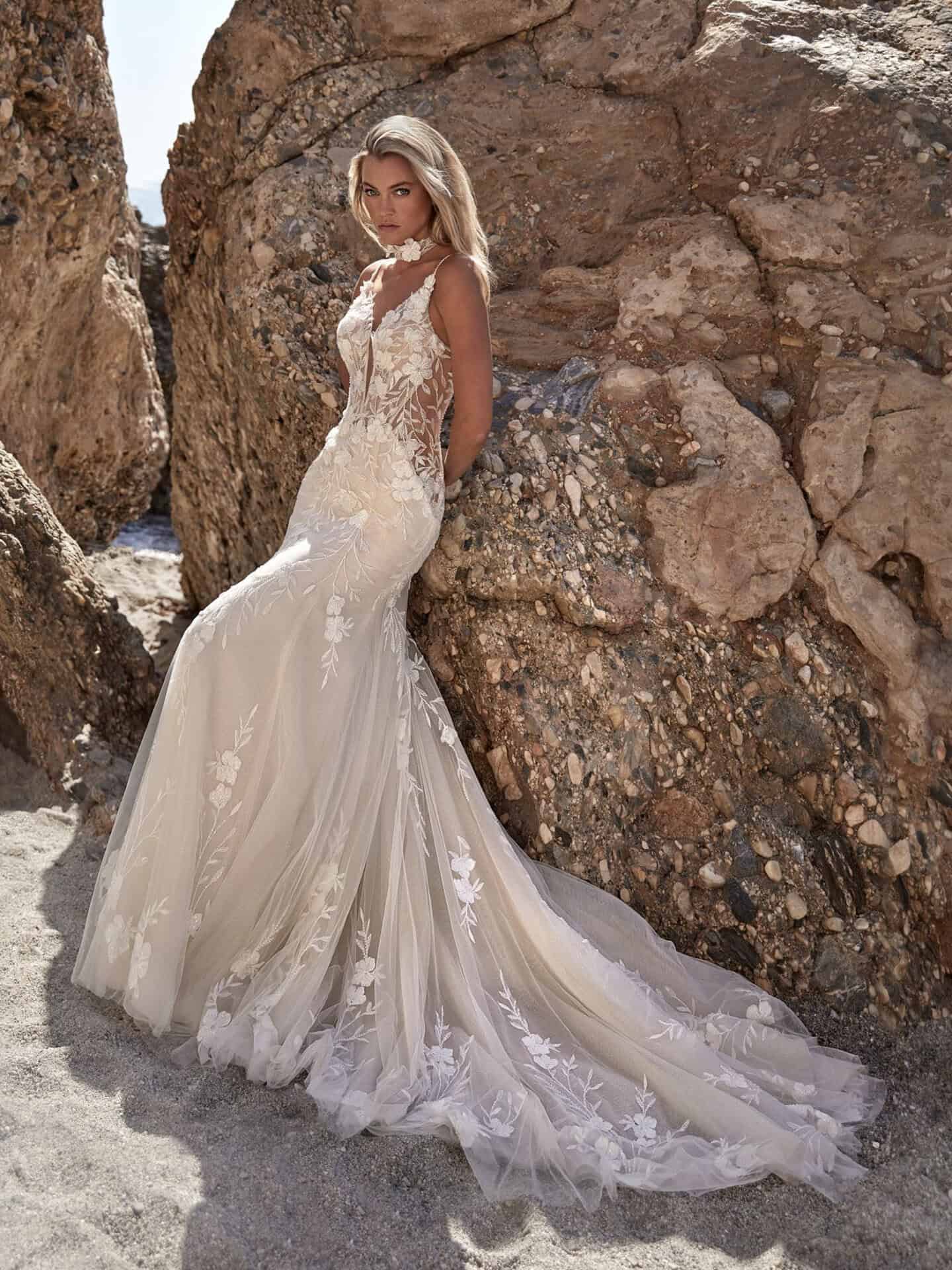 De jurk 15004 van Amélie is een fit & flare jurk in nude tinten met een zachte glinstering. De transparante kanten top met beading heeft een V-hals en fijne spaghettibandjes. De lage rug en subtiele cut-outs geven de jurk een open lijn. De bijpassende choker sluit hier mooi op aan en de rok loopt uit in een sleep.