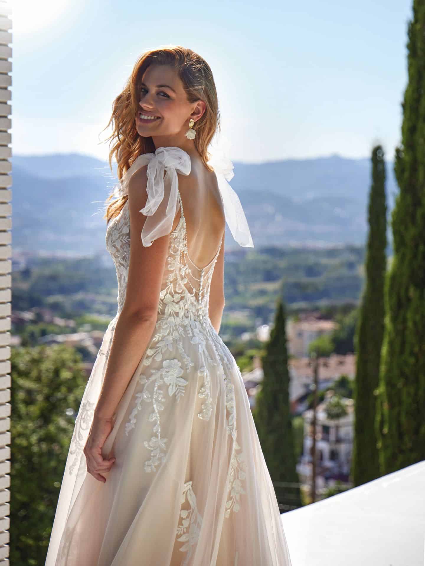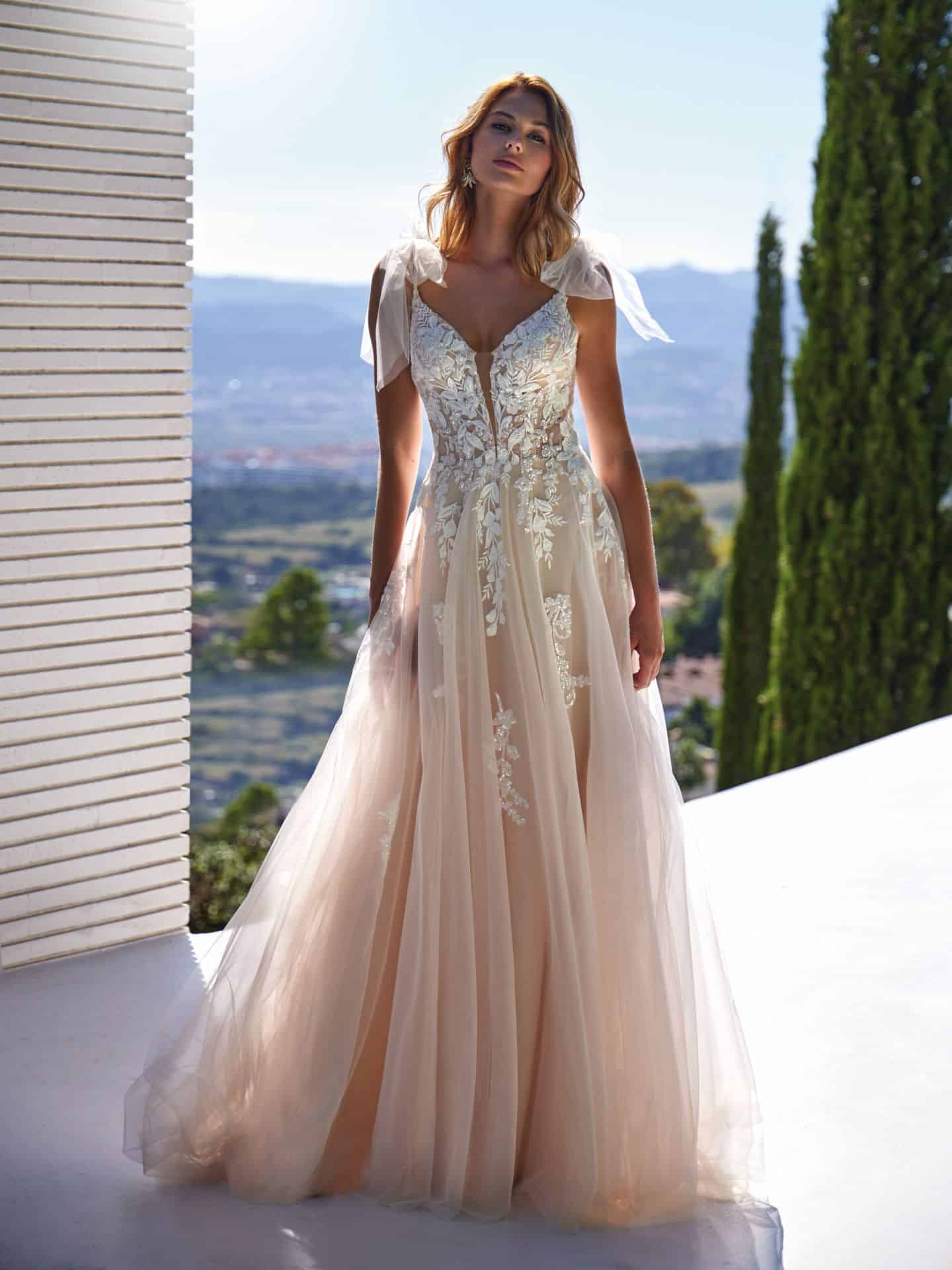 De jurk 20363 van Amélie is een A-lijn jurk in zachte blush tinten met een kanten top vol fijne beading. De V-hals wordt gedragen door schouderbandjes die elegant in een strik vallen. De lage rug is subtiel gedecoreerd en de rok vloeit zacht uit in een sleep.