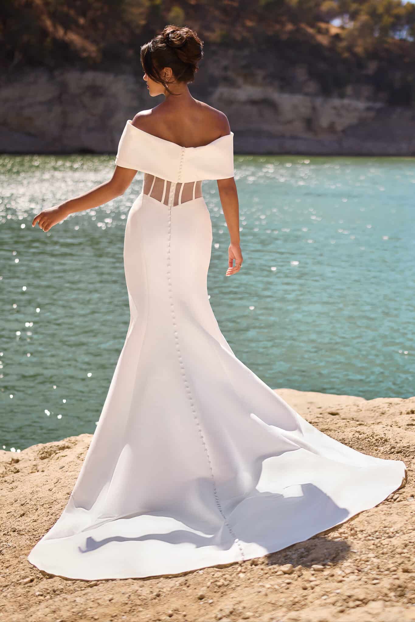 Deze prachtige moderne bruidsjurk in zeemeerminstijl, gemaakt van Mikado-stof, heeft afneembare stola die een asymmetrisch lijfje creëert. De achterkant toont een dramatisch doorschijnend korsetje. De rok is versierd met stijlvolle stoffen knopen die van de taille tot aan de punt van de sleep lopen