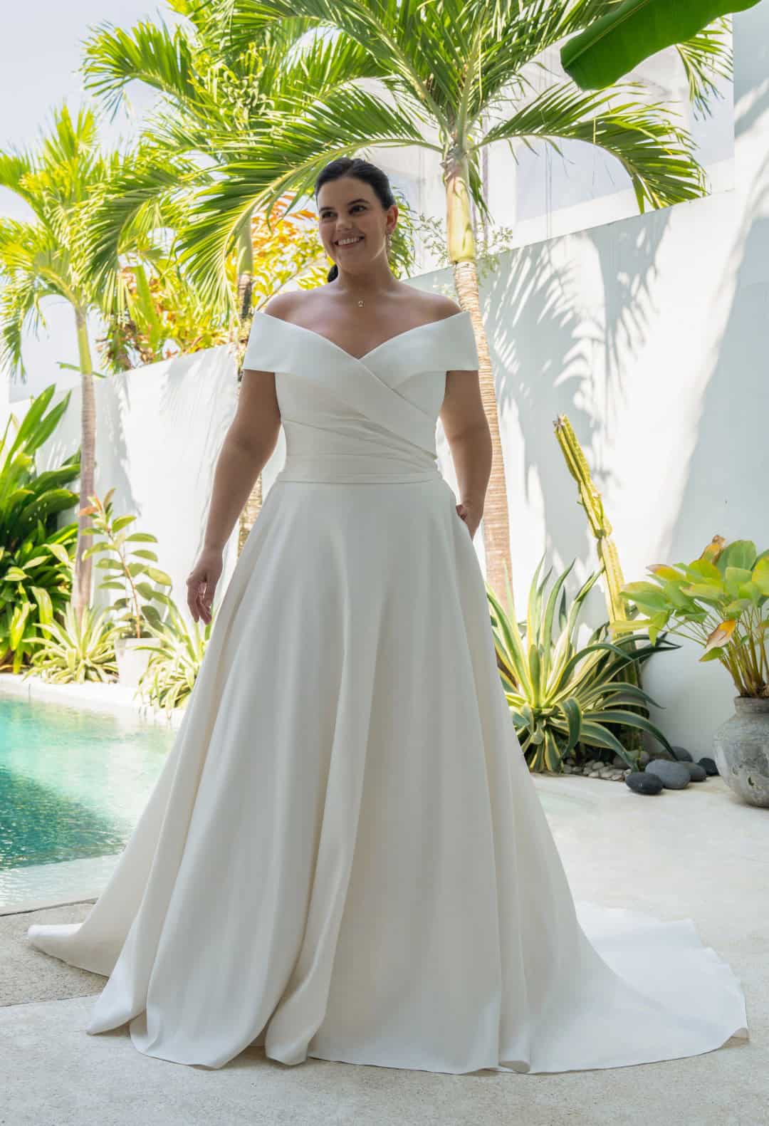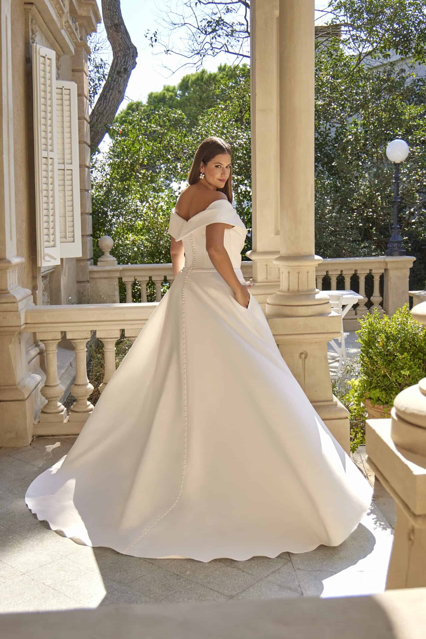 De jurk 30166W van Amélie is een plus size A-lijn jurk van soepel satijn met een zacht gedrapeerde top en V-hals. De off-shoulder bandjes rusten elegant op de schouders, de tailleband omlijnt de taille en de knoopjes lopen door tot over de sleep. De rok valt vloeiend uit en heeft subtiele steekzakken.