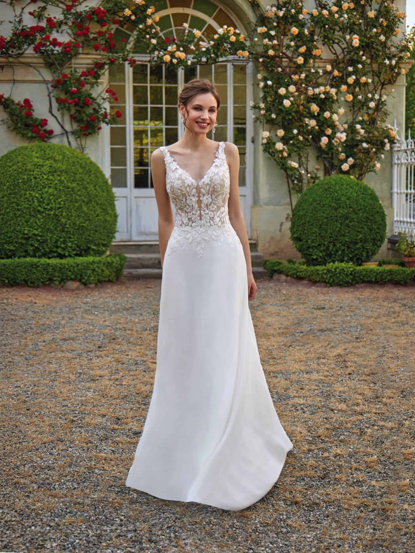 De A-lijn trouwjurk lijkt op een letter ‘A’ en is een van de meest geliefde silhouetten onder bruiden. Dit silhouet benadrukt de taille, valt soepel over de heupen en brengt brede schouders in balans. De A-lijn is beschikbaar in meerdere varianten; van een wijd uitlopende tot een lichte A-lijn.