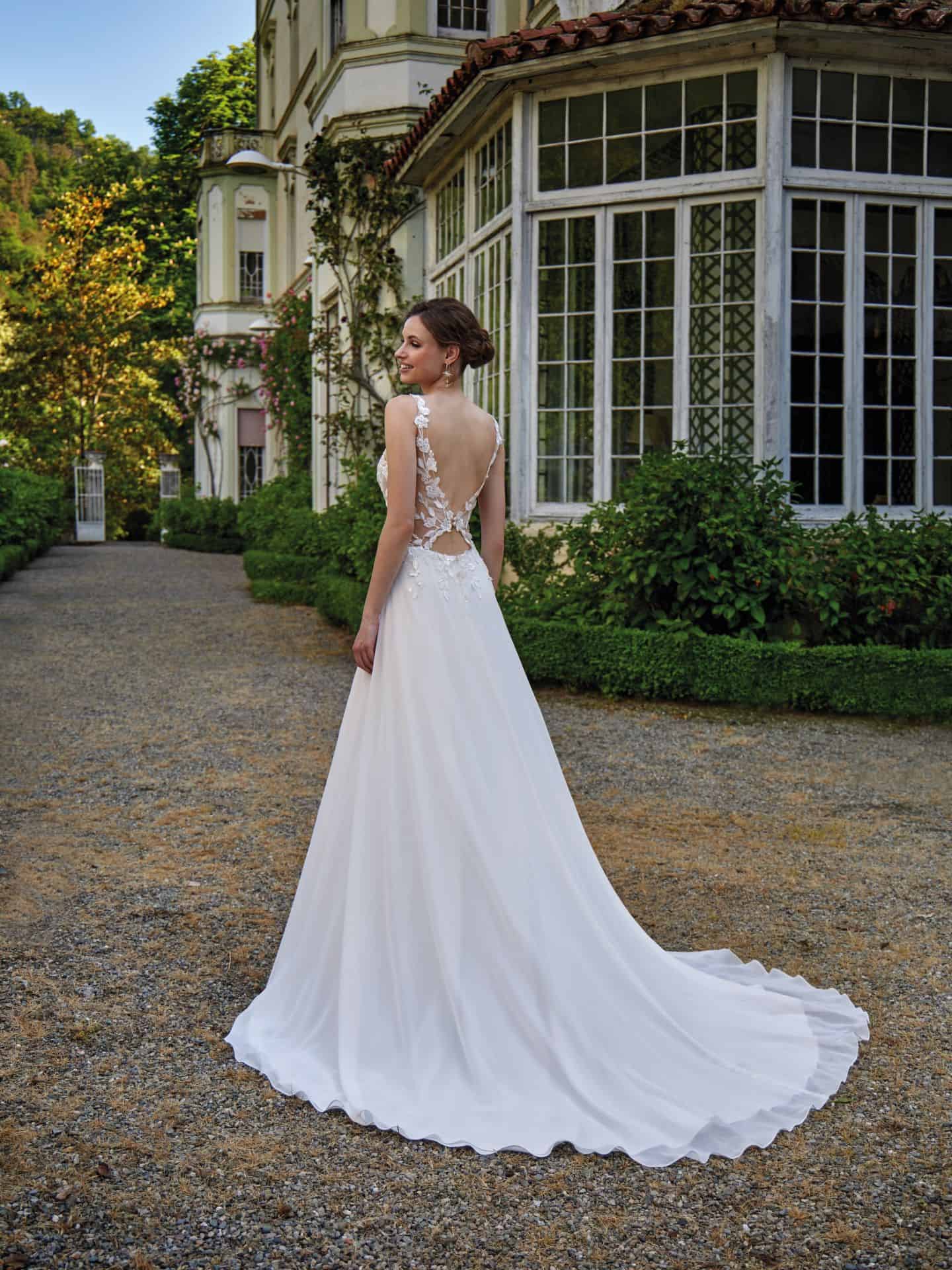 Model 40069 van Amélie is een verfijnde trouwjurk met een transparante kanten top van bloemenkant, subtiel afgewerkt met beading. De V-hals met fijne schouderbandjes en de elegante keyhole rug geven de jurk een vrouwelijke en licht verleidelijke uitstraling. De soepelvallende chiffon rok in A-lijn met een sierlijke sleep zorgt voor een luchtige, romantische beweging bij iedere stap.