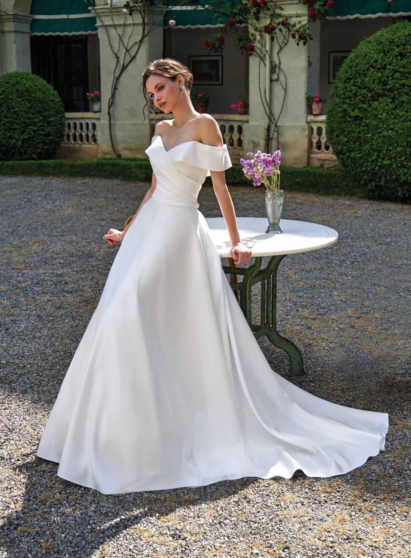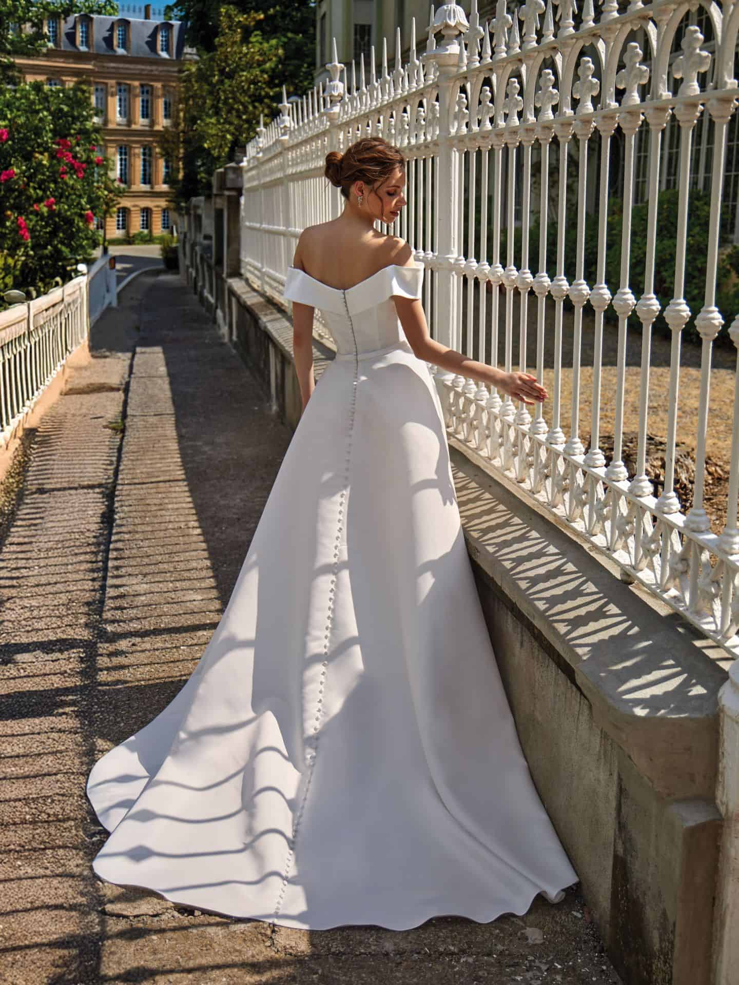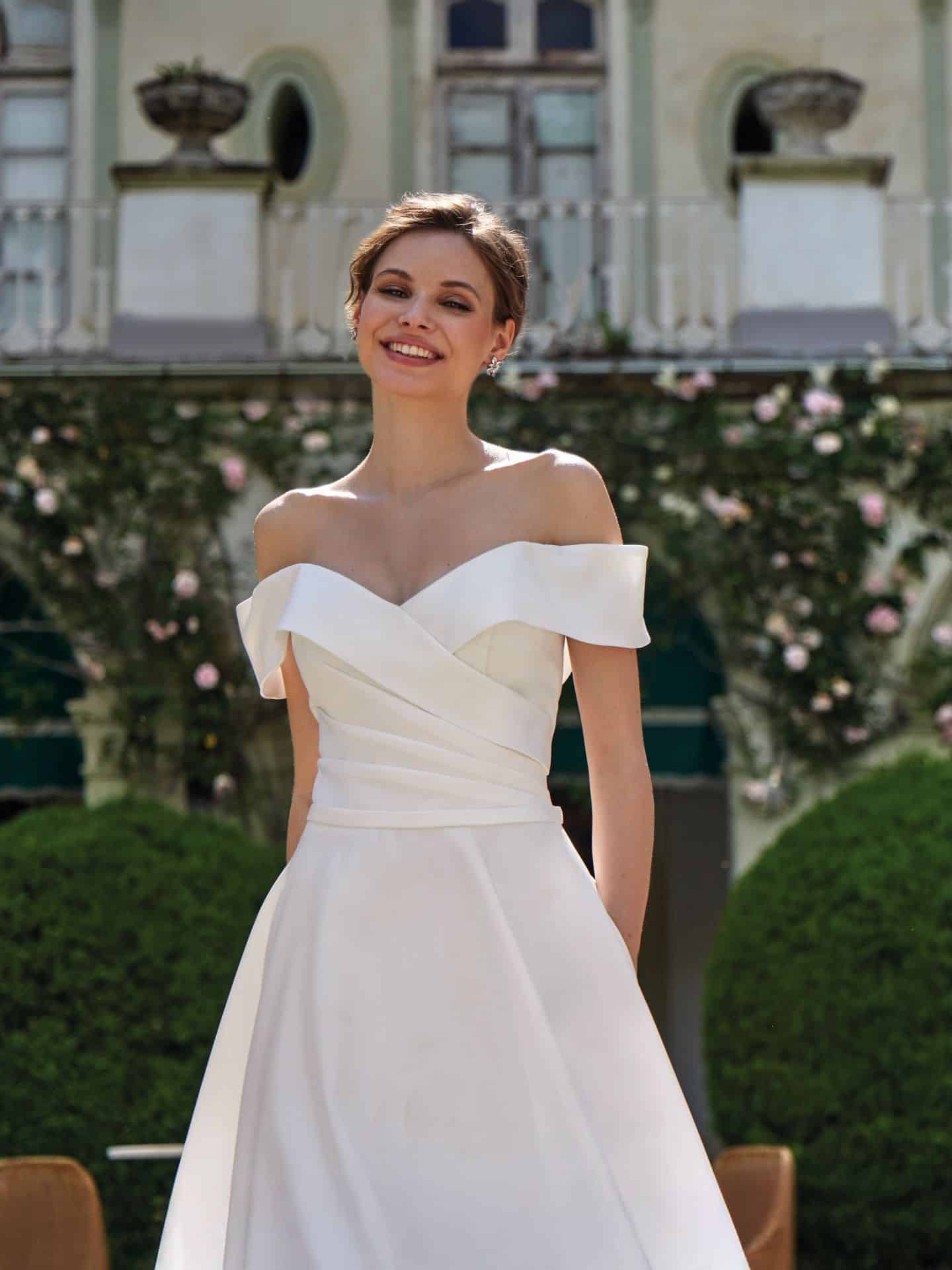 Model 45030 van Amélie is een satijnen trouwjurk met off-shoulder bandjes en een sweetheart halslijn. De gedrapeerde taille volgt zacht de vormen van het lichaam terwijl de A-lijn rok met knoopjes die doorlopen tot over de sleep soepel valt en een elegante beweging creëert.