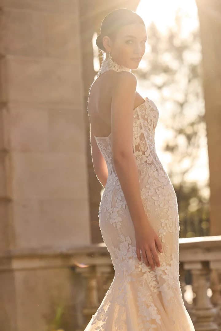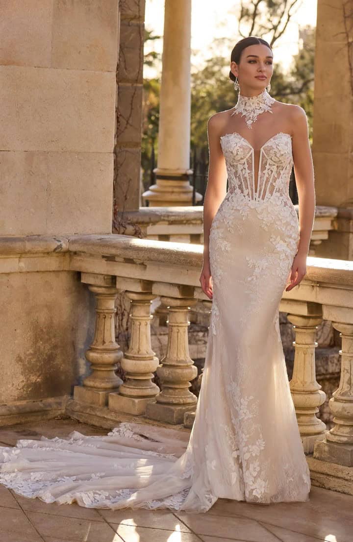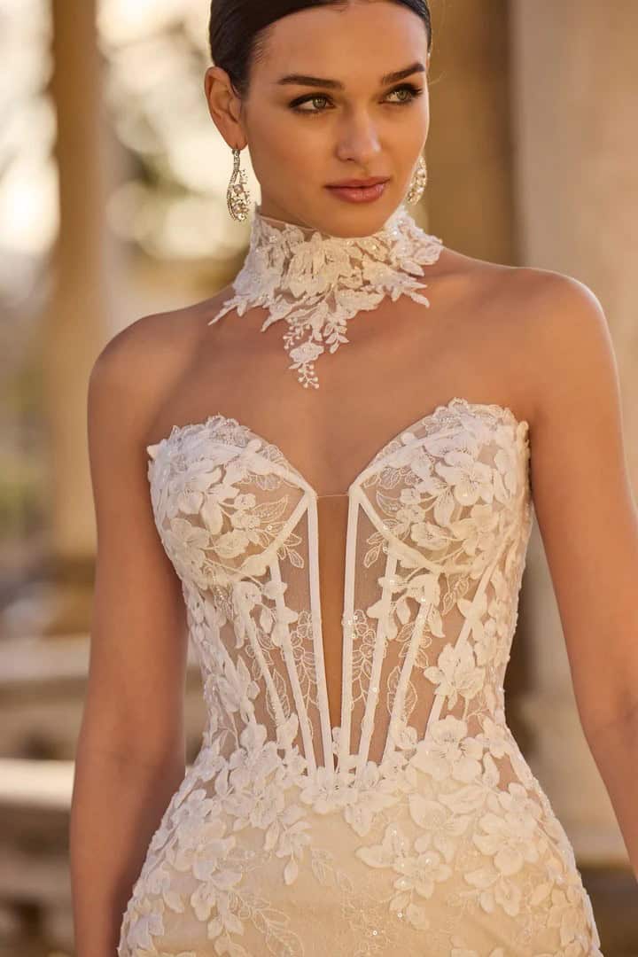 Trouwjurk Halimah van Veni Infantino is een unieke fit & flare jurk met een glamoureuze uitstraling. De jurk is gemaakt van nude glittertule met prachtig bloemenkant en heeft een strapless corset met sweetheart halslijn. De kanten choker zorgt voor een uniek en gedurfd accent. Dankzij het transparante lijfje en de vrouwelijke pasvorm is Halimah een perfecte keuze voor de moderne bruid die wil stralen met een sexy en elegante look.