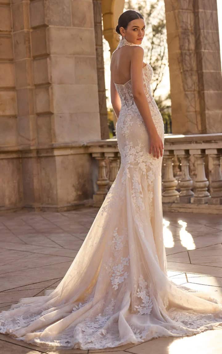 Het fit & flare silhouet (ook wel trompet genoemd) heeft een strak lijfje en valt aansluitend over de billen, om vervolgens nét boven de knie wijd uit te lopen. Deze stijl accentueert de heupen en billen voor een sexy, vrouwelijke look. Het is ook een uitstekende keuze voor een kleinere bruid, omdat het de lengte verlengt en het figuur mooi in balans brengt.