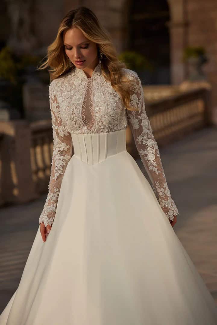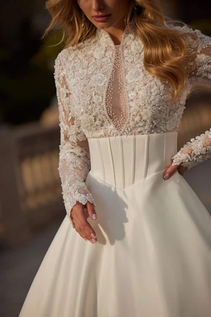 Trouwjurk Hanford van Veni Infantino is een moderne prinsessenjurk met oog voor detail. De transparante kanten top is rijkelijk versierd met beading en parels, en heeft een hoge halslijn en lange mouwen voor een elegante uitstraling. De dichte rug en corset-achtige taille met basque waist geven de jurk een verfijnd silhouet. De satijnen rok met steekzakken maakt het geheel stijlvol en praktisch, terwijl de sleep zorgt voor een klassieke finish. Perfect voor de bruid die luxe en comfort wil combineren.