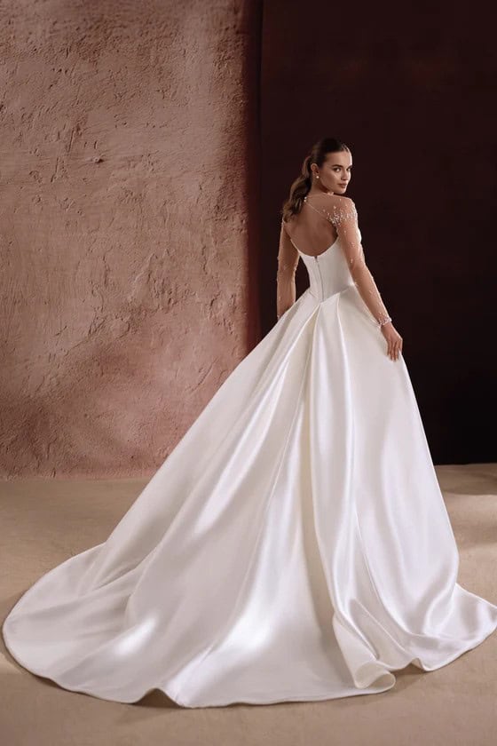 De trouwjurk Aylin van Dama Couture is een moderne fit & flare van mikado met een minimalistische uitstraling. De strapless top heeft een cat eye halslijn en een mooie gedrapeerde afwerking. De basque waist benadrukt het silhouet.