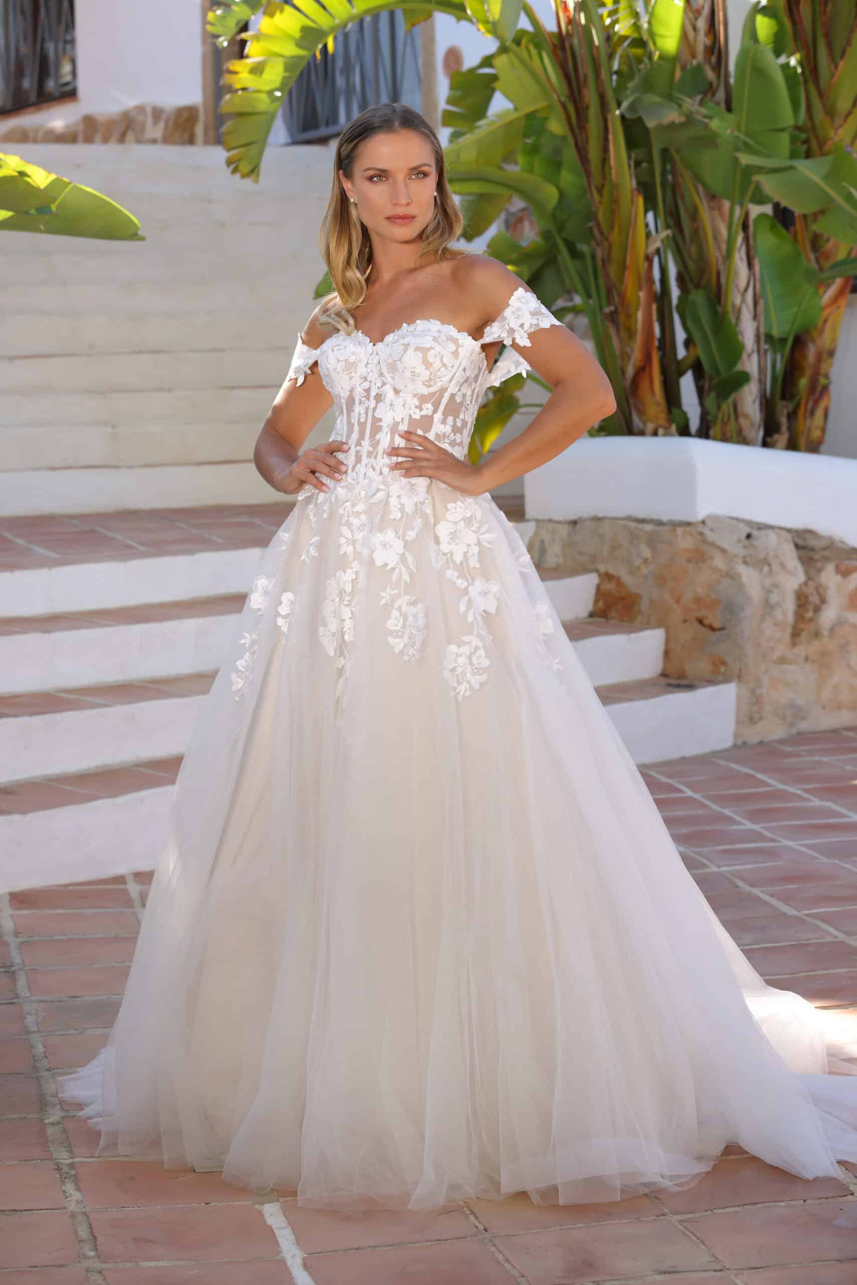 Trouwjurk Bridget van Azuree is een romantische A-lijn jurk met een transparante corset-top van bloemenkant. De sweetheart halslijn en afneembare off-shoulder bandjes geven de jurk een zachte en vrouwelijke uitstraling. De basque waist loopt over in een lichte tule rok met een elegante sleep. De rijgsluiting op de rug zorgt voor een mooie pasvorm. Verkrijgbaar in twee kleuren én ook te passen in een grote maat in onze winkel.