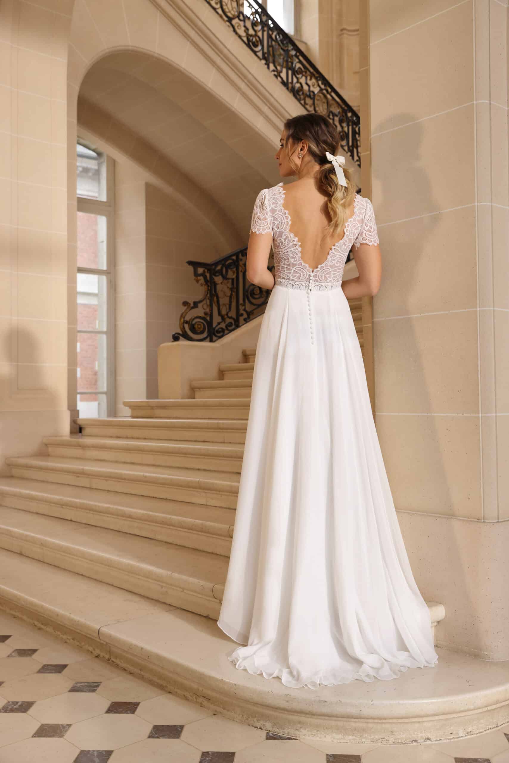 Trouwjurk Charity is ideaal voor de bruid die houdt van een vrouwelijke en moeiteloos stijlvolle look. De kanten top met korte mouwen en diepe V-hals ademt boho charme, terwijl de transparante rug met fijne knoopjes een subtiel sensueel accent toevoegt. De soepelvallende chiffon rok met lichte plooien beweegt luchtig met je mee, perfect voor een romantische bruiloft.