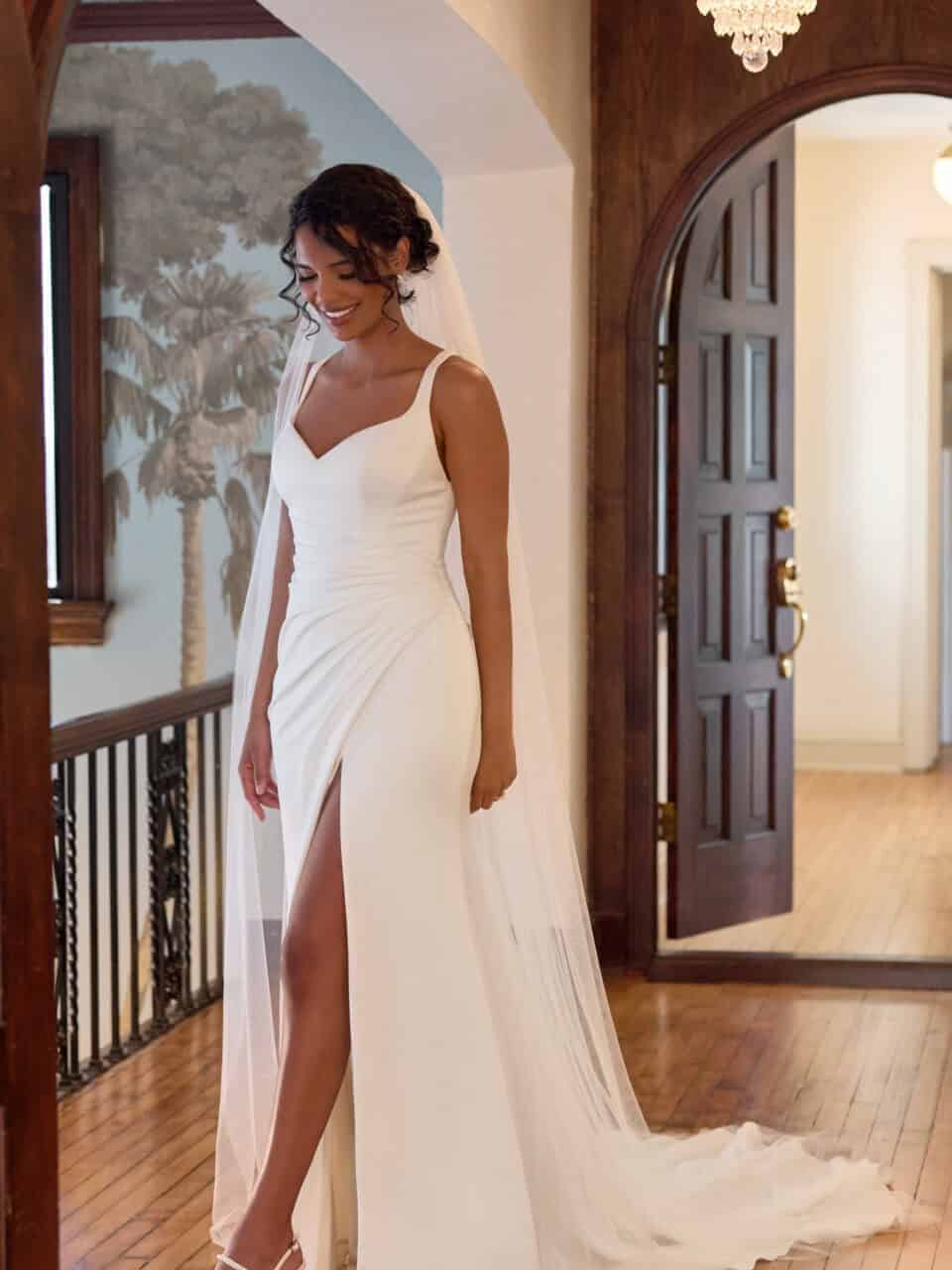 Model D4439 van Essense of Australia is een moderne fit & flare trouwjurk voor de bruid die houdt van eenvoud met een sexy uitstraling. Gemaakt van strak crêpe materiaal zorgt deze jurk voor een clean silhouet dat het lichaam mooi volgt. De v-halslijn en smalle schouderbandjes geven een elegante basis, terwijl de diepe v-rug zorgt voor een verfijnde maar gedurfde touch. Rond de heupen valt de stof in een subtiele drapering die de taille benadrukt en de vormen versterkt. De split aan de voorkant biedt beweging en een moderne uitstraling zonder dat het geheel zijn balans verliest. Tot slot zorgt de sleep met knoopjessluiting tot het einde voor een luxe afwerking.
