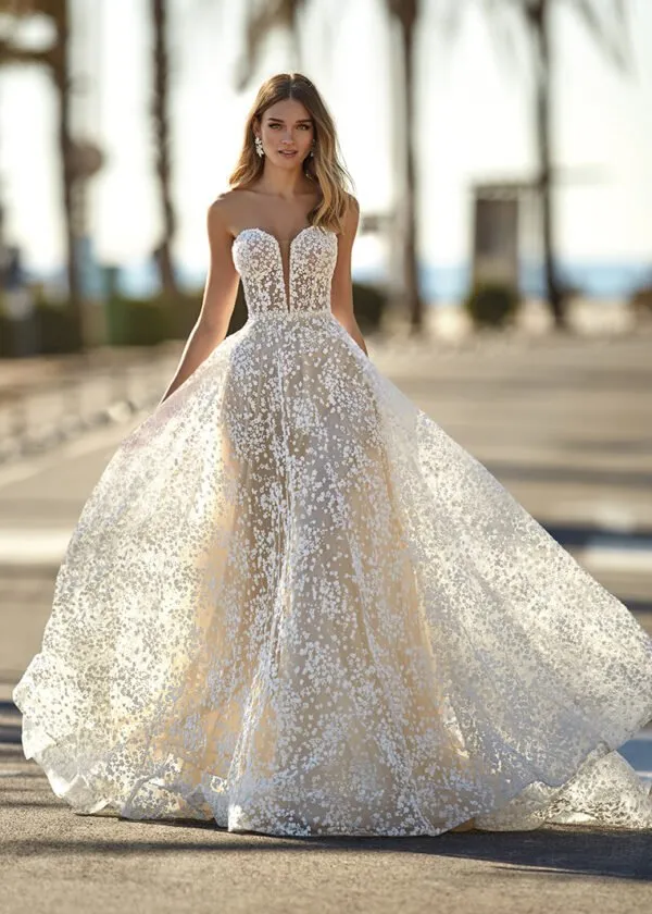 De A-lijn trouwjurk lijkt op een letter ‘A’ en is een van de meest geliefde silhouetten onder bruiden. Dit silhouet benadrukt de taille, valt soepel over de heupen en brengt brede schouders in balans. De A-lijn is beschikbaar in meerdere varianten; van een wijd uitlopende tot een lichte A-lijn.