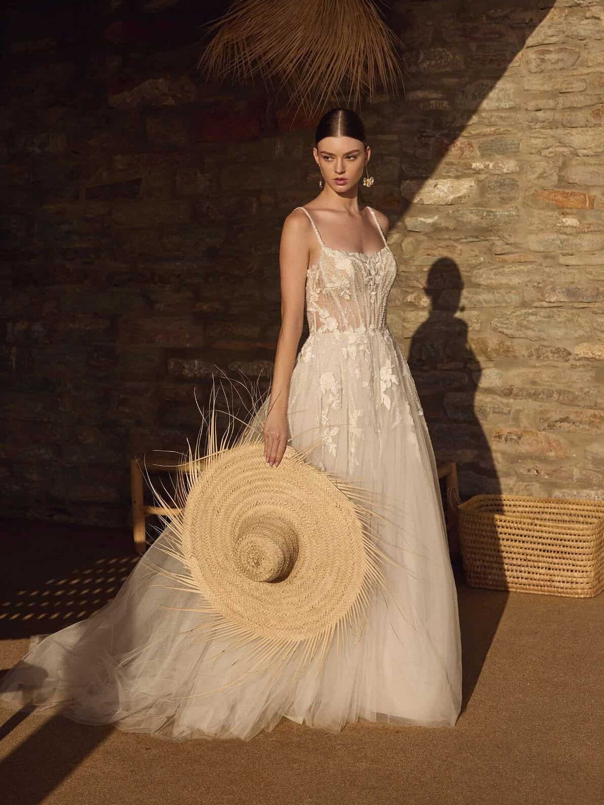 De Henrike trouwjurk is een romantische A-lijn met een verfijnde bloemenkanten top, subtiele beading en een elegante cat eye halslijn met spaghettibandjes. Baleinen in het lijfje zorgen voor mooie steun, terwijl knoopjes op de rug een klassieke touch geven. De rok van lichte tule valt soepel in een sierlijke sleep. Verkrijgbaar in twee kleuren in onze winkel.