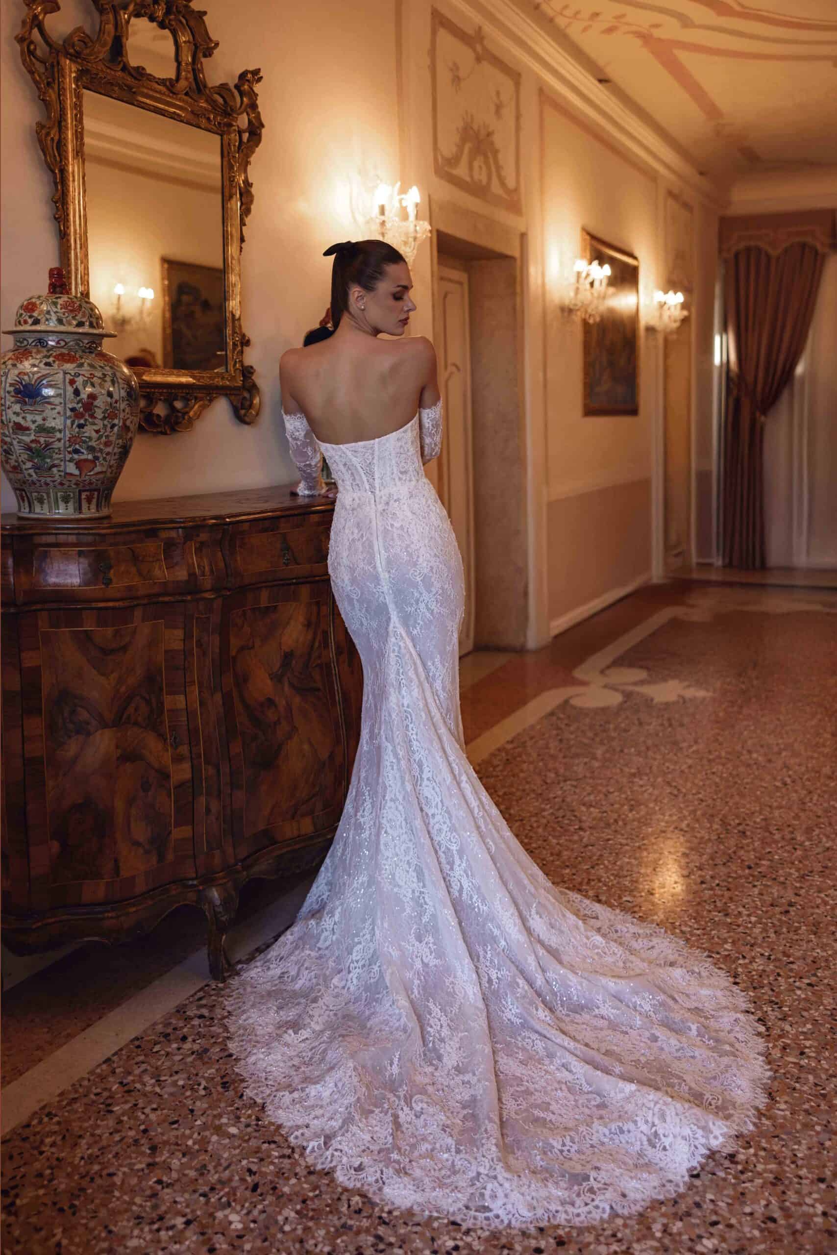 Deze fit and flare jurk heeft een stijlvolle en verleidelijke uitstraling. De top is gemaakt van kant met zichtbare baleinen en een sweetheart halslijn die het decolleté mooi laat uitkomen. De basque waist benadrukt je figuur op een elegante manier. De lange mouwen zijn afneembaar en geven de jurk een speels detail dat je naar wens kunt dragen. De rok sluit strak aan en loopt uit in een sleep.