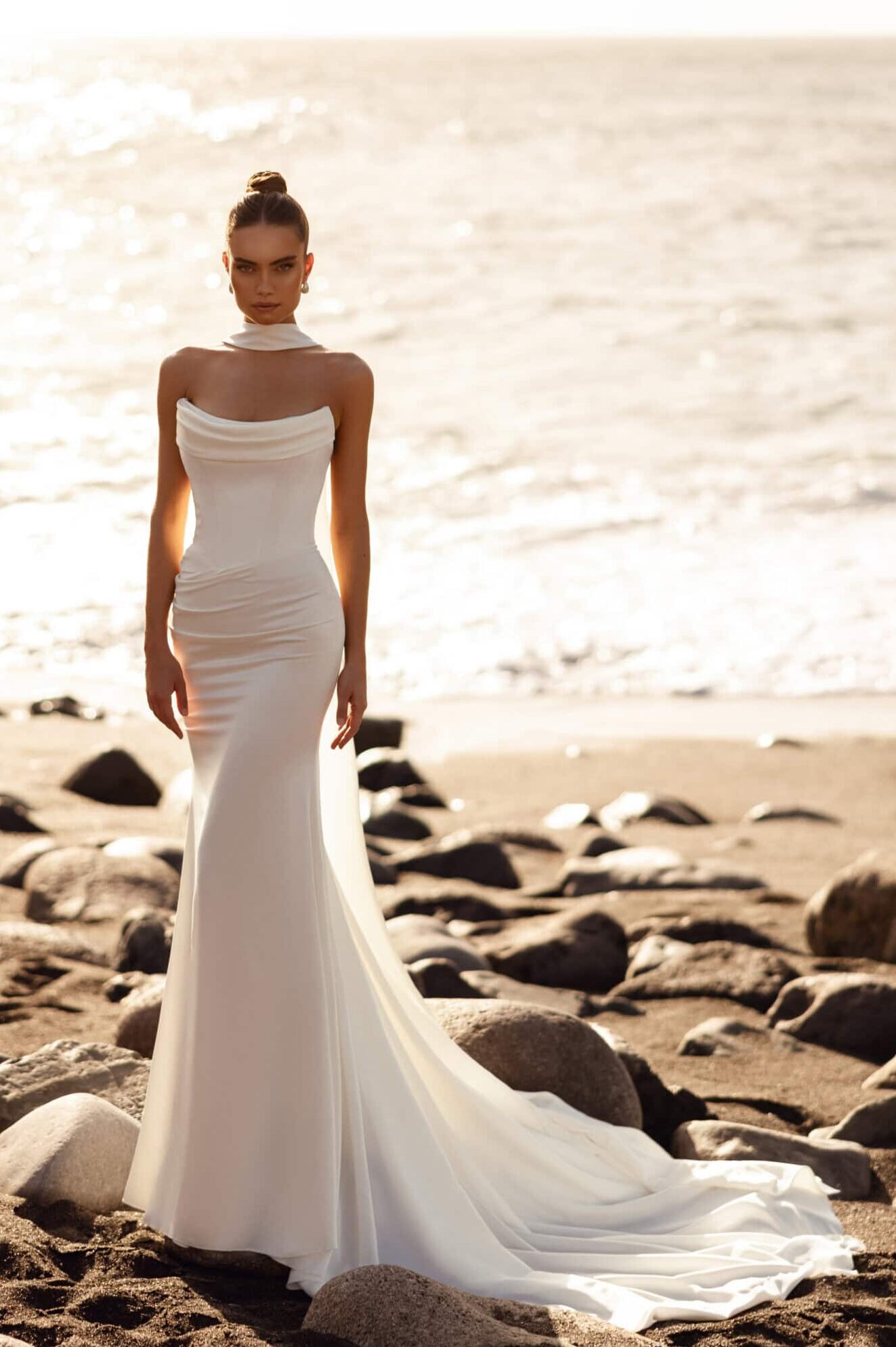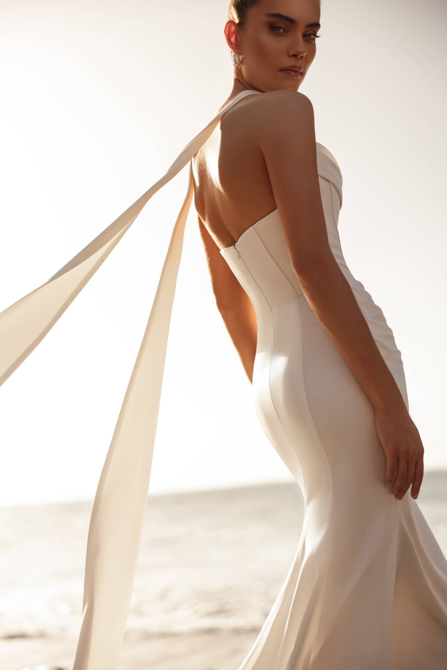 De Luna van Dama Couture is een mermaid-jurk van soepel crêpe met een moderne, cat-eye halslijn. De strapless korsettop en de gedrapeerde heup accentueren het silhouet op een subtiele manier. De losse stola biedt variatie in draagstijl, terwijl de sleep zorgt voor een elegante finish. Een tijdloze keuze voor de bruid die houdt van eenvoud met karakter.