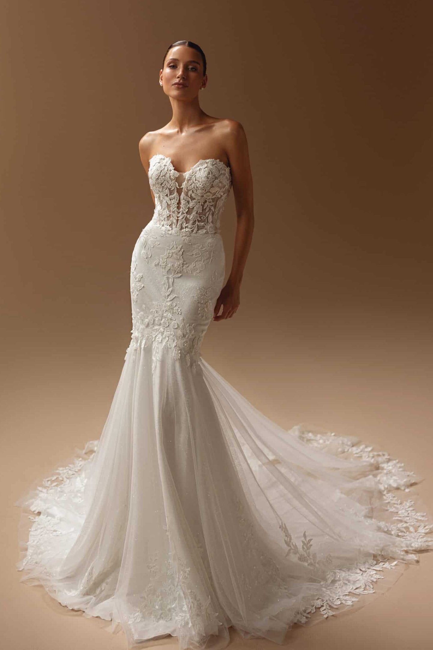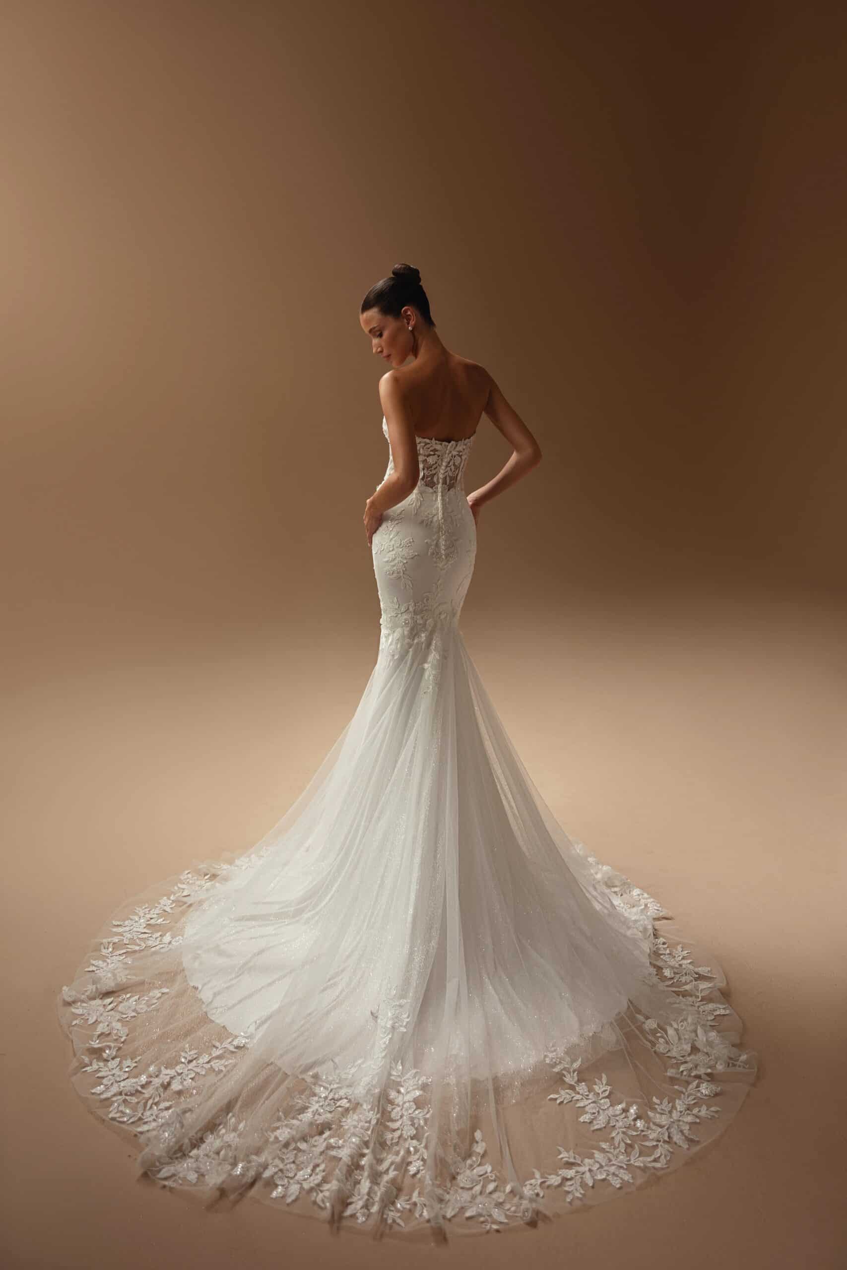 De trouwjurk Luna van Tina Valerdi is een strapless mermaidjurk met een uitgesproken vrouwelijke look. De sweetheart halslijn en nauwsluitende pasvorm accentueren het figuur. De jurk is gemaakt van twee lagen kant en afgewerkt met 3D-bloemen en beading voor extra detail. De rok volgt het lichaam en loopt uit in een elegante sleep. Een sexy jurk met romantische accenten, perfect voor de bruid die net wat meer durft.