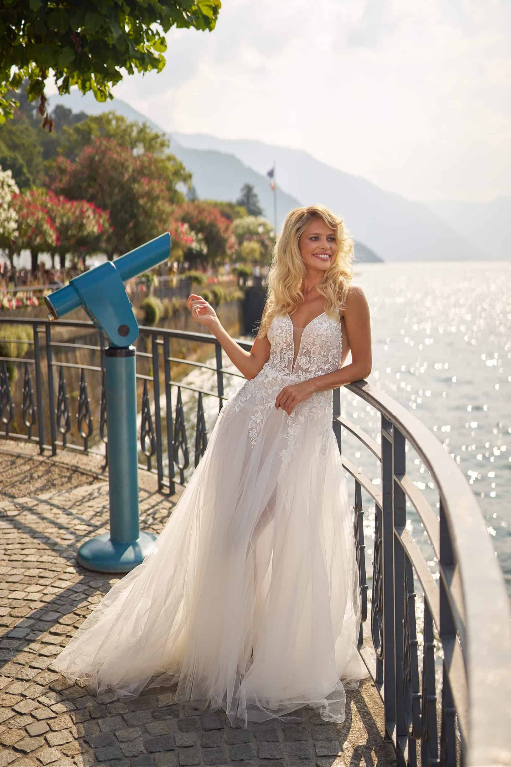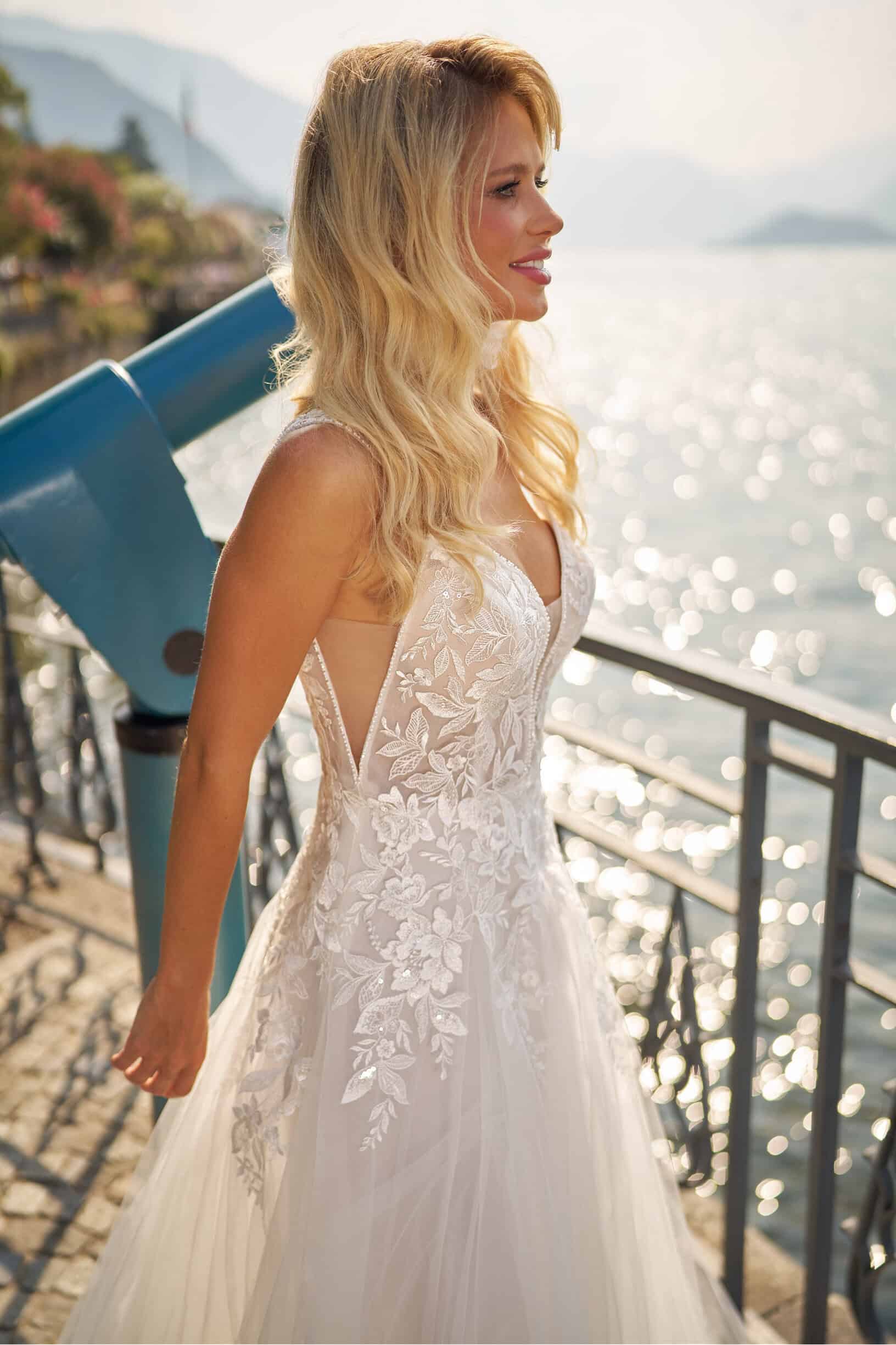 De A-lijn trouwjurk lijkt op een letter ‘A’ en is een van de meest geliefde silhouetten onder bruiden. Dit silhouet benadrukt de taille, valt soepel over de heupen en brengt brede schouders in balans. De A-lijn is beschikbaar in meerdere varianten; van een wijd uitlopende tot een lichte A-lijn.
