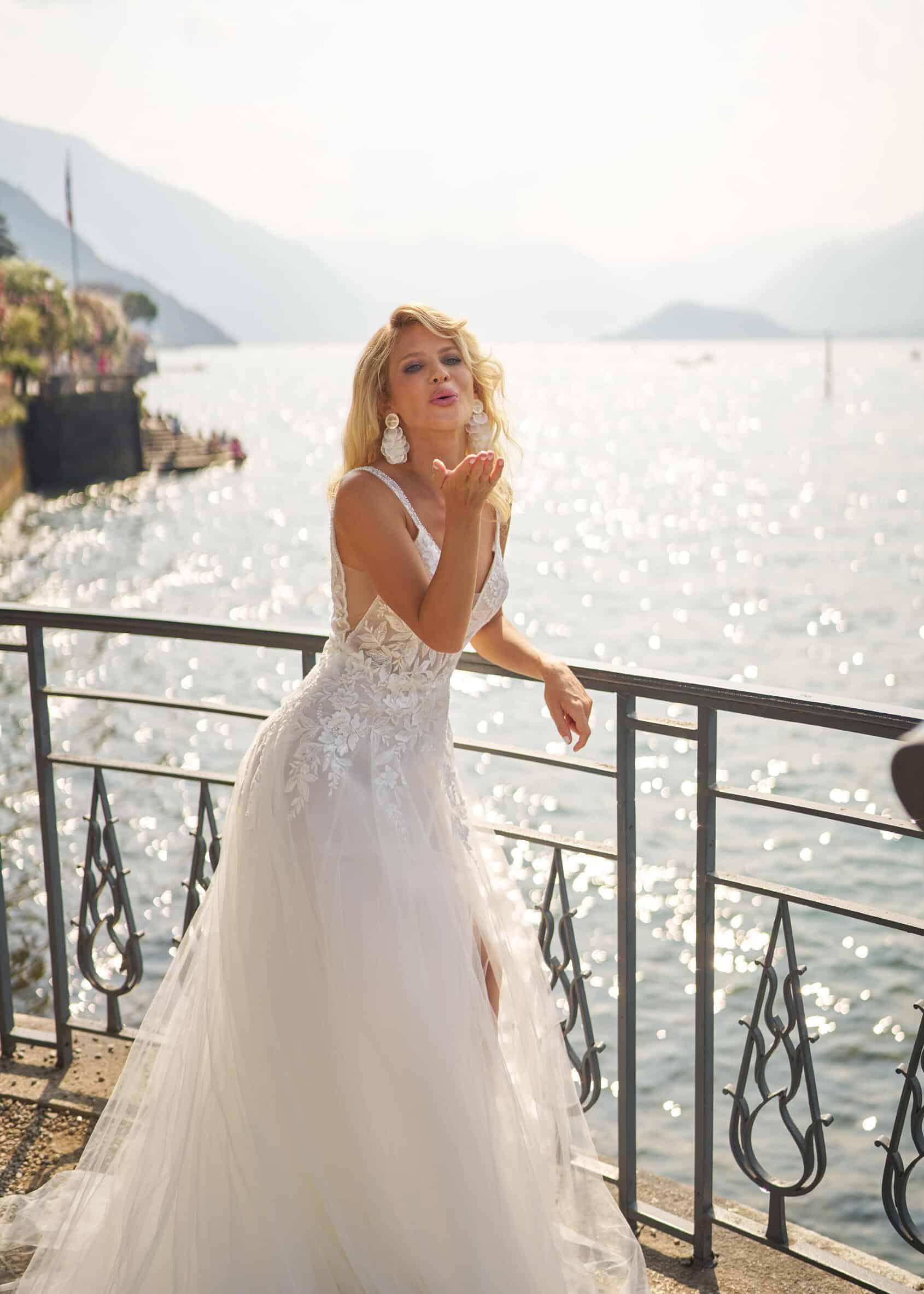 De Manu jurk is een etherische A-lijn jurk met een delicaat illusionistisch kanten lijfje. Deze prachtige jurk heeft schouderbandjes en een V-hals met diep decolleté dat een vleugje allure toevoegt. De verstopte split maakt het plaatje compleet. Perfect voor bruiden die zoeken een tijdloze maar fascinerende look.
