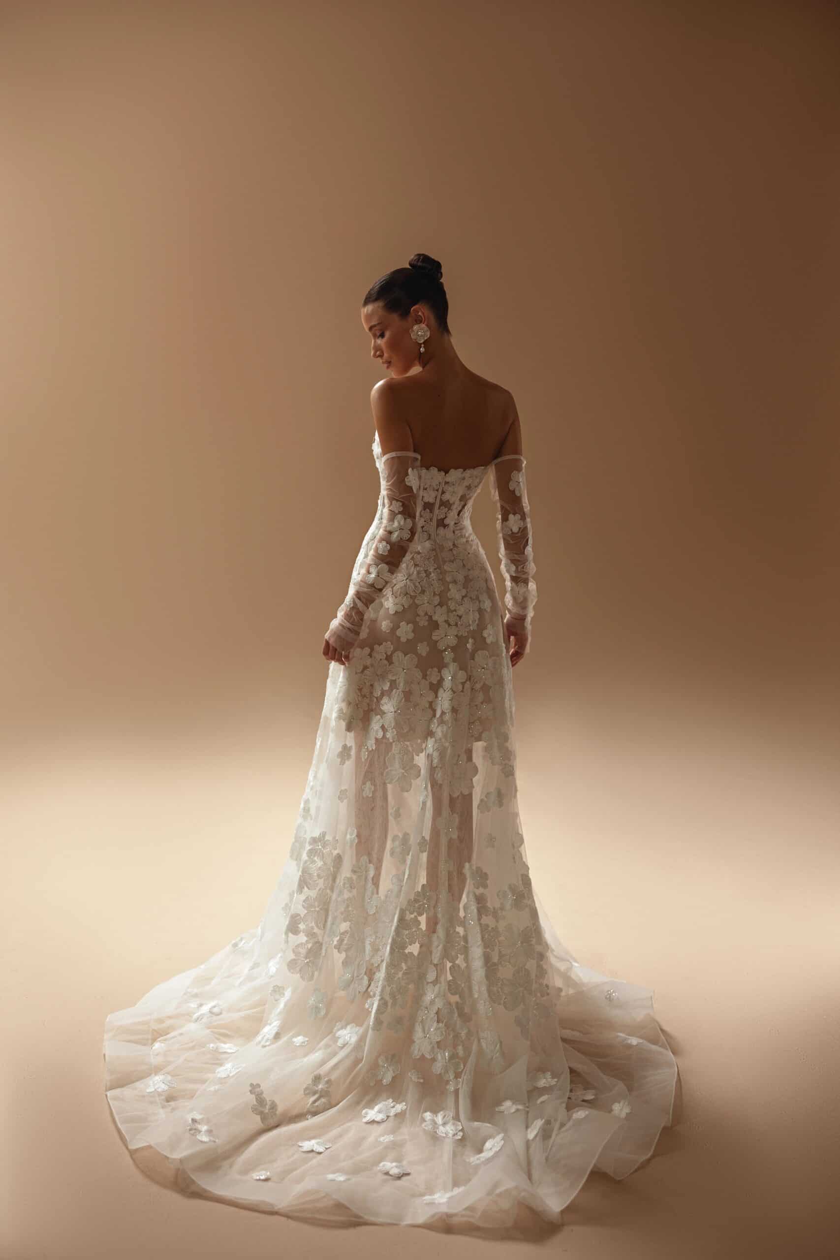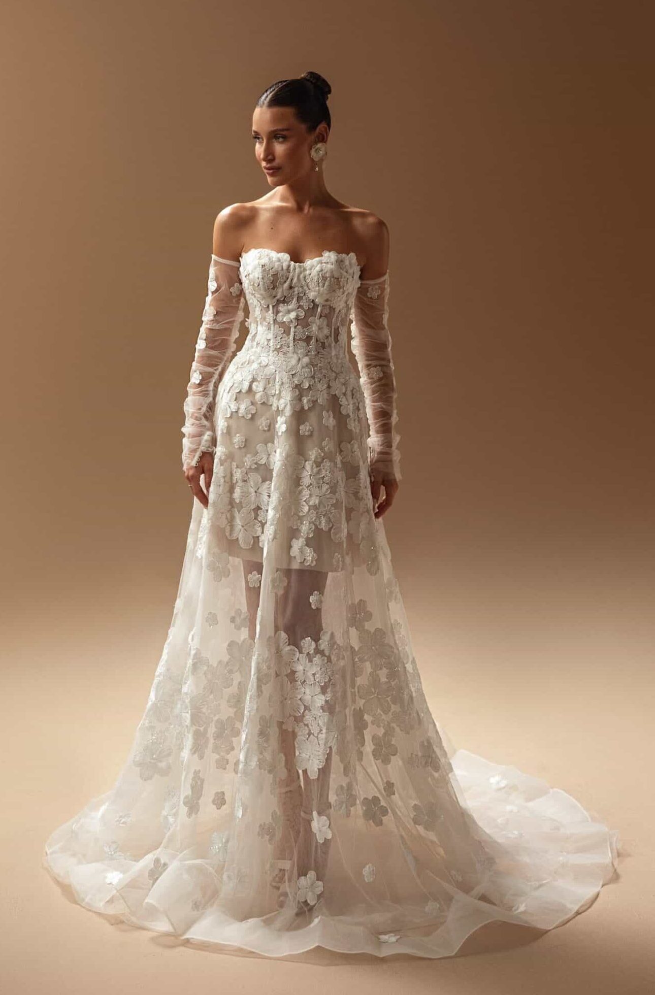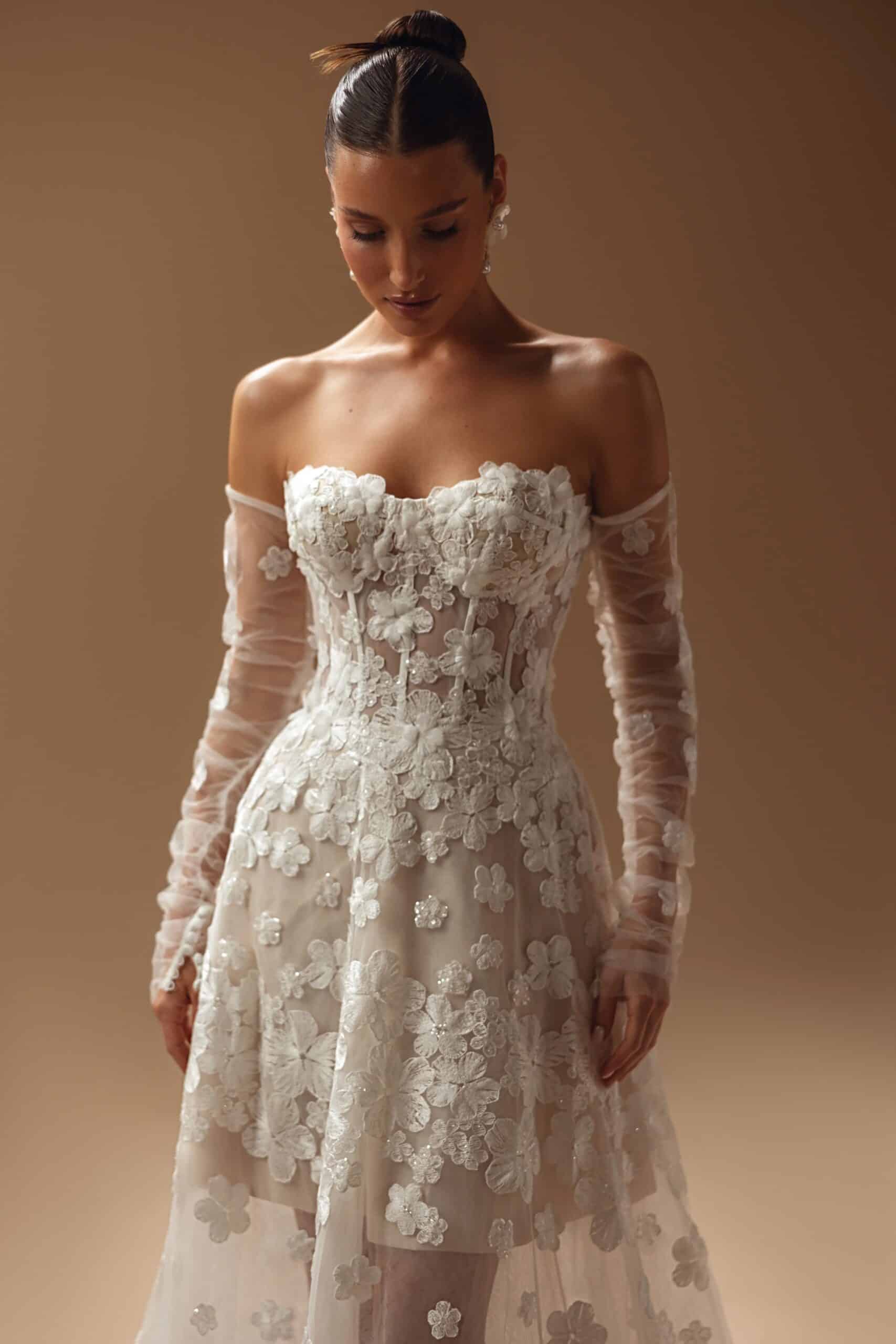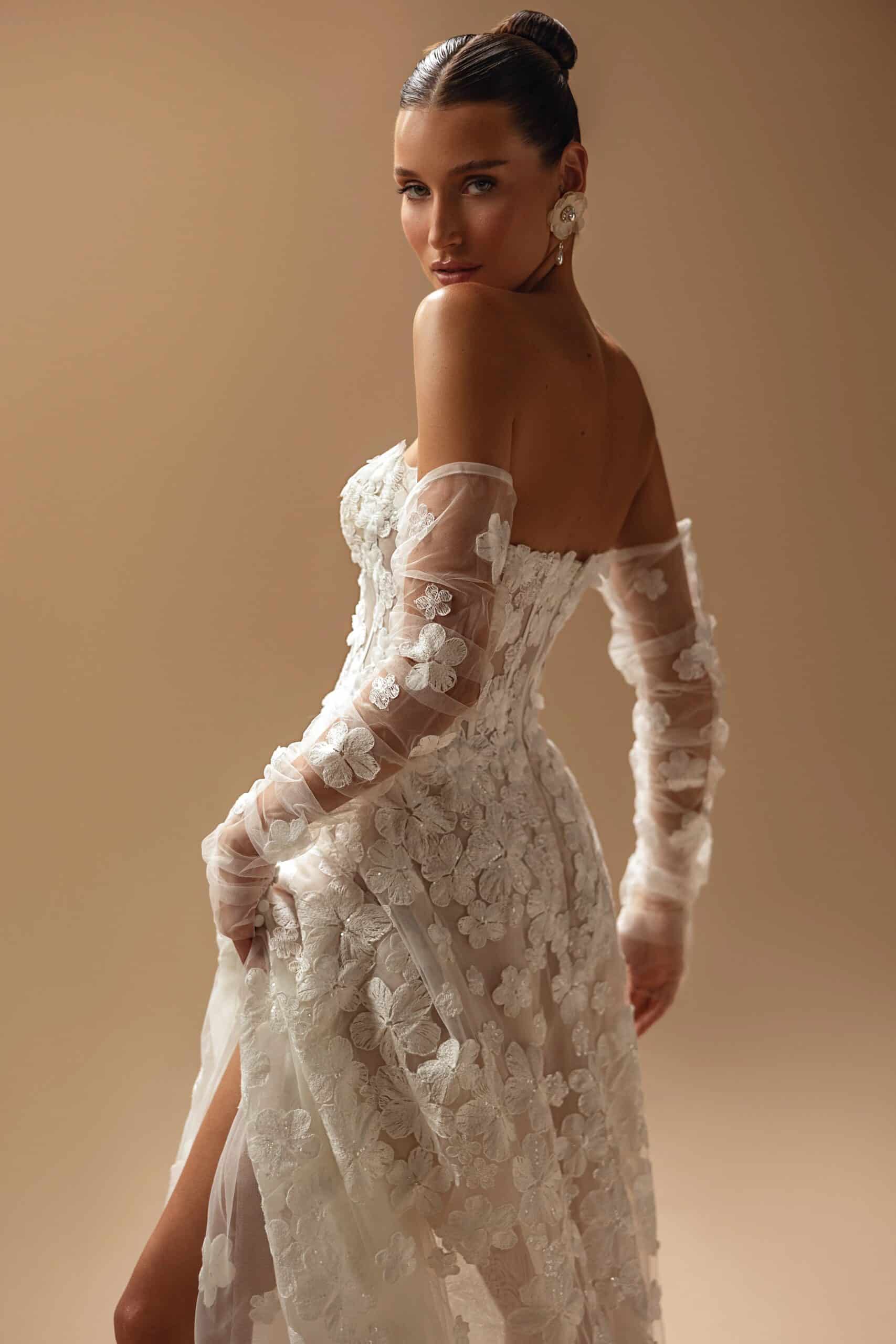 De trouwjurk Miley van Tina Valerdi is een romantische a-lijn jurk met een nude basis en bloemenkant met 3D-bloemen. De corset-achtige top heeft een zachte sweetheart halslijn en wordt gecombineerd met afneembare lange mouwen voor een extra dromerige look. De rok valt licht en soepel en loopt uit in een elegante sleep. Let op: ons winkelmodel heeft een lange onderrok, dus geen korte versie zoals op de foto.