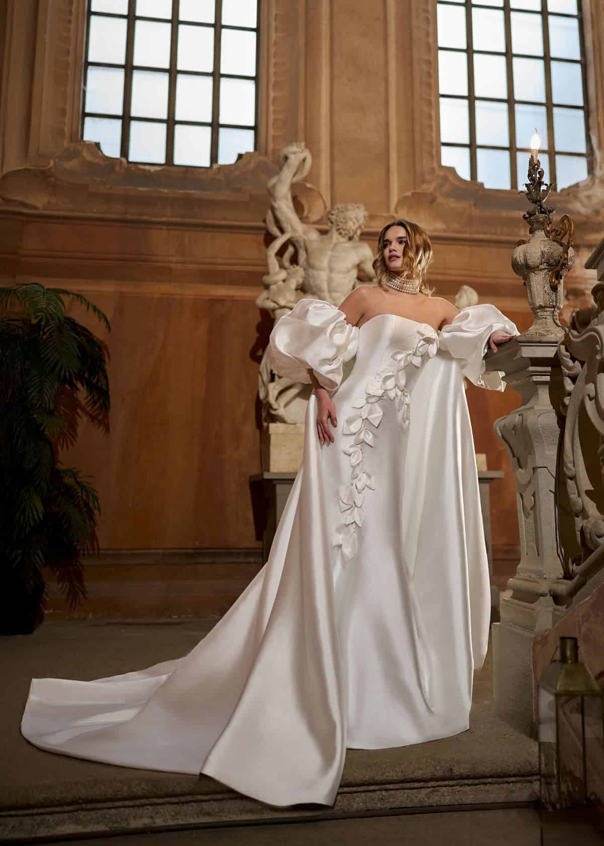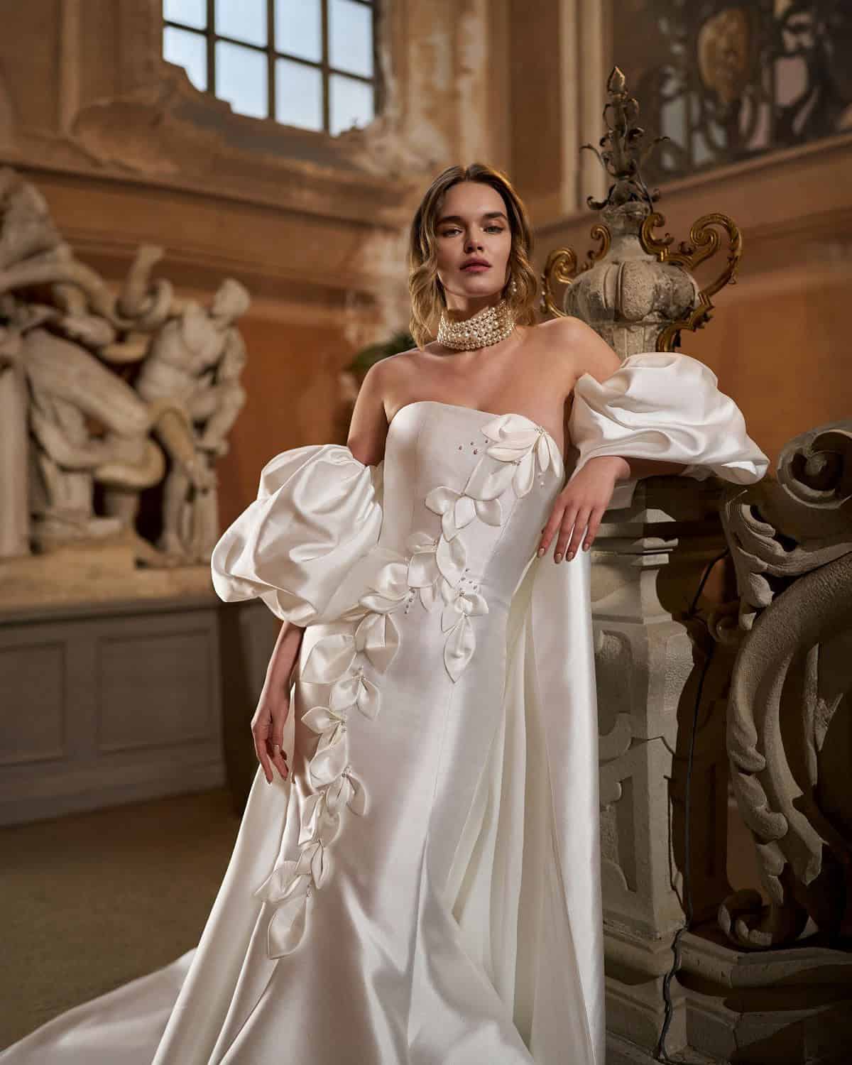De trouwjurk Nairobi van Hervé is een moderne mermaidjurk van stevig mikado. De strapless top heeft een ronde halslijn en is versierd met een subtiele applicatie van 3D-bladeren en parels. De rok sluit mooi aan en loopt uit in een elegante sleep. Less is more, met een verfijnd detail. Het bijpassende jasje is apart verkrijgbaar, zodat je jouw look helemaal eigen kunt maken.