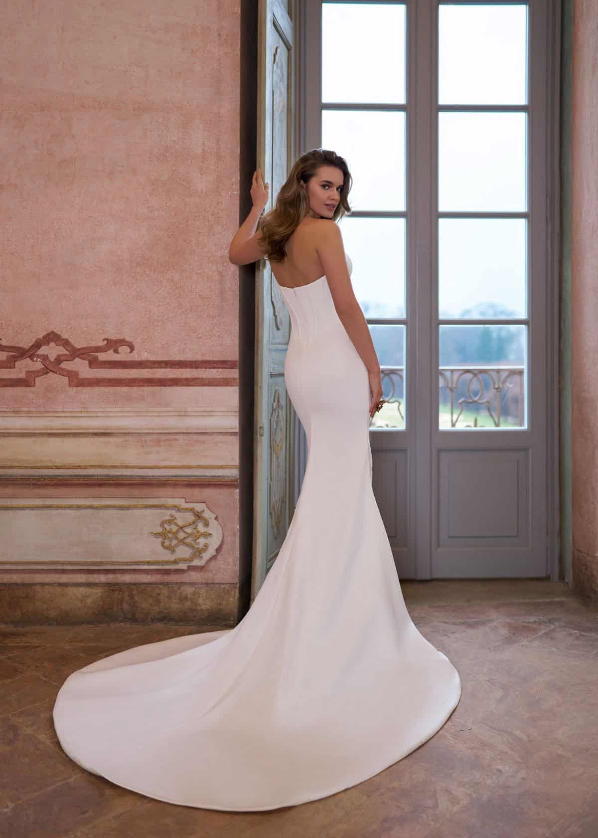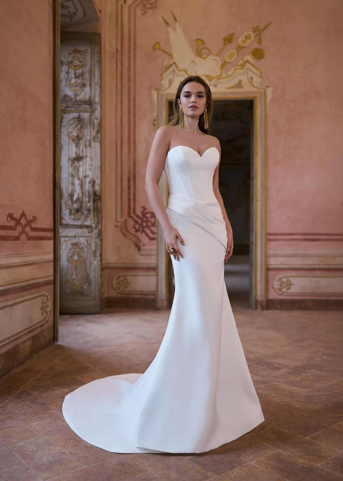 De trouwjurk Nathalie van Hervé is een moderne fit & flare van glad satijn. De strapless, corsetachtige top heeft een zachte sweetheart halslijn en een basque waist die mooi overloopt in een gedrapeerde taille. De rok sluit vrouwelijk aan en eindigt in een rustige sleep. Een less is more jurk met een krachtige, elegante uitstraling.