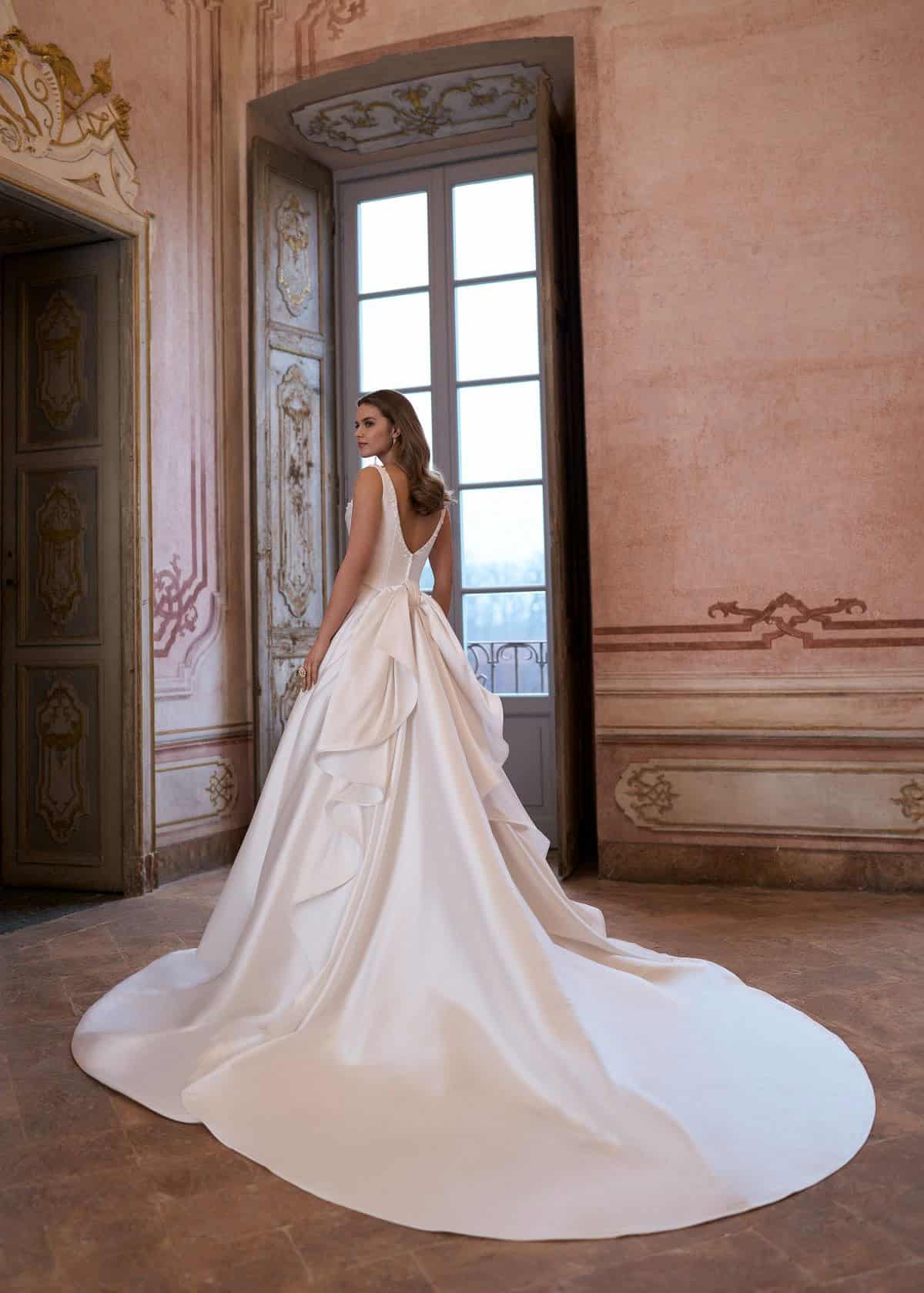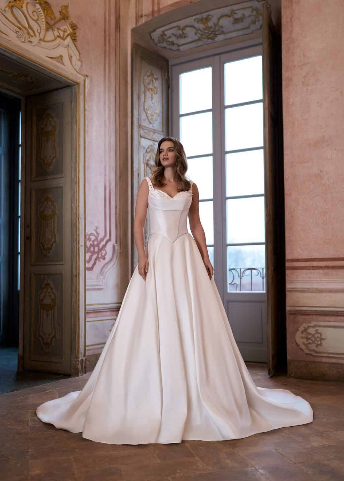 De trouwjurk Nidia van Hervé is een stijlvolle 3-delige look bestaande uit een top, rok en losse sleep. De corsetachtige top is versierd met parels, heeft schouderbandjes, een sweetheart halslijn en een V-rug. De basque waist sluit mooi aan en loopt over in een prinsessenrok van mikado. De afneembare sleep met strik maakt de look compleet. Elegant, modern en nét even anders.