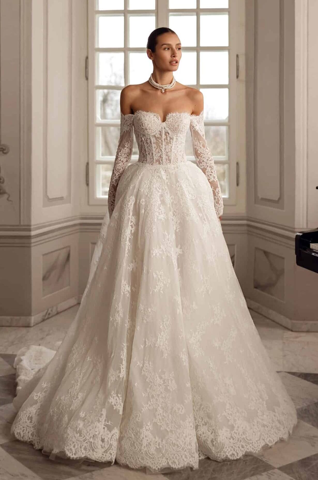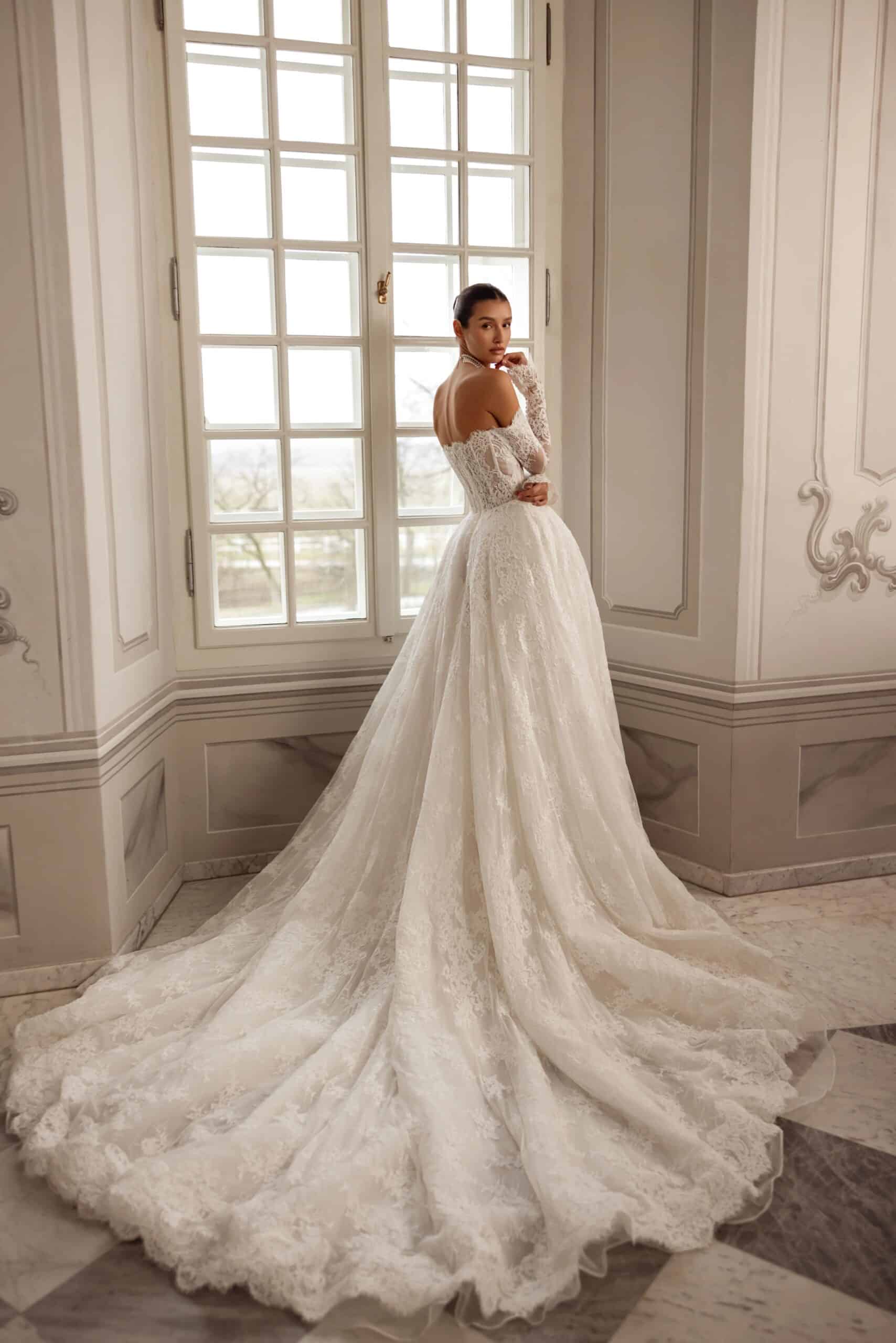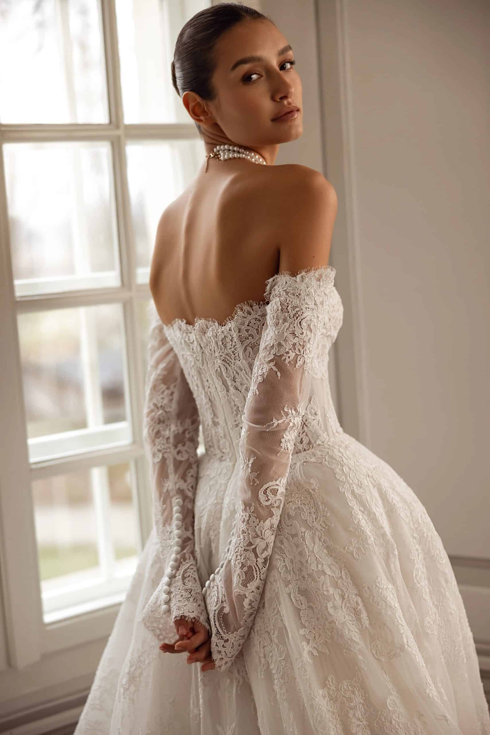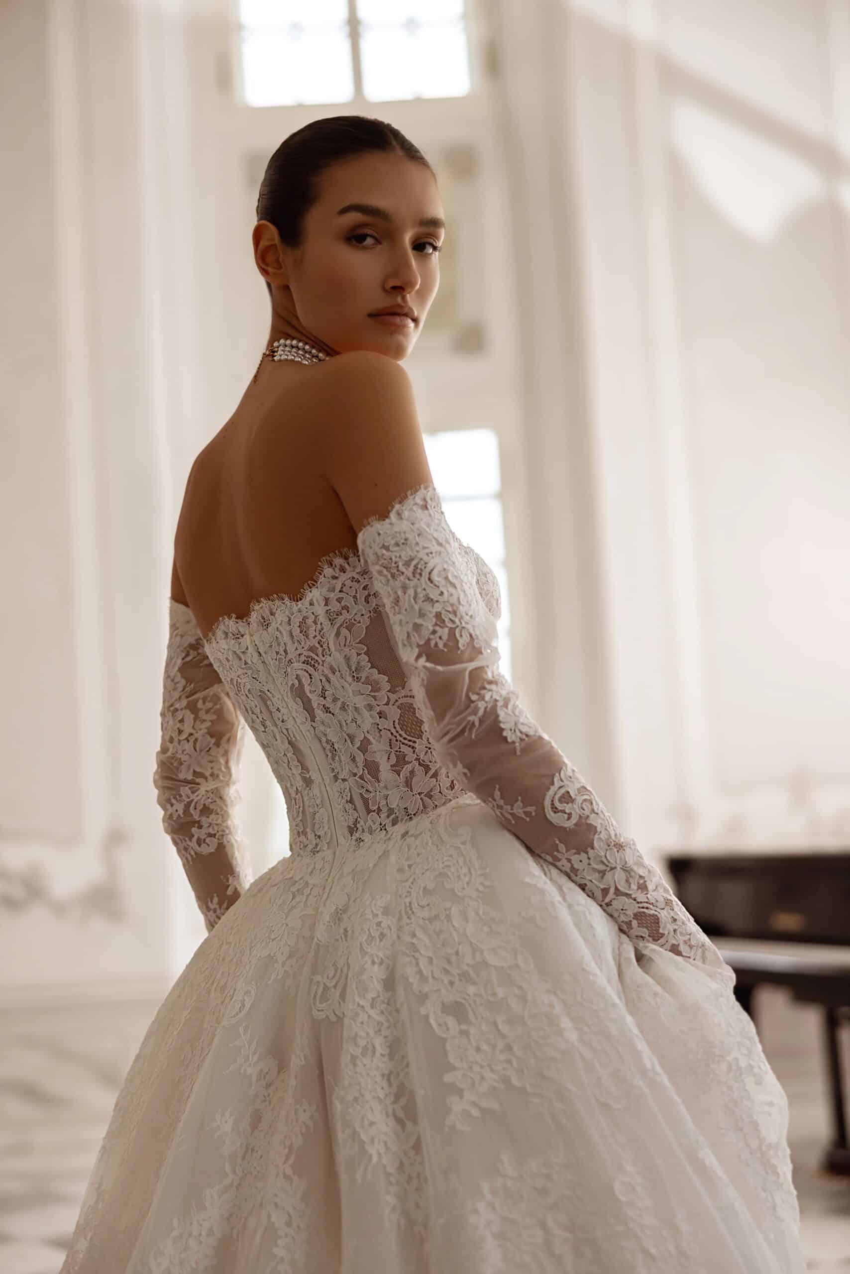 De trouwjurk Ramona van Tina Valerdi is een klassieke prinsessenjurk gemaakt van verfijnd Frans kant. De corsetachtige top heeft een zachte sweetheart halslijn en off shoulder lange mouwen die zorgen voor een elegante en vrouwelijke uitstraling. De rok is vol en loopt uit in een lange sleep met fijne kantdetails. Een tijdloze jurk voor de bruid die gaat voor een romantisch en klassiek silhouet.