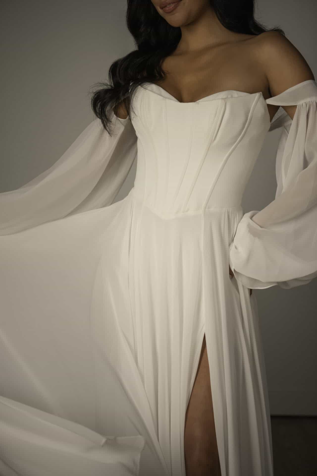 De A-lijn trouwjurk lijkt op een letter ‘A’ en is een van de meest geliefde silhouetten onder bruiden. Dit silhouet benadrukt de taille, valt soepel over de heupen en brengt brede schouders in balans. De A-lijn is beschikbaar in meerdere varianten; van een wijd uitlopende tot een lichte A-lijn.