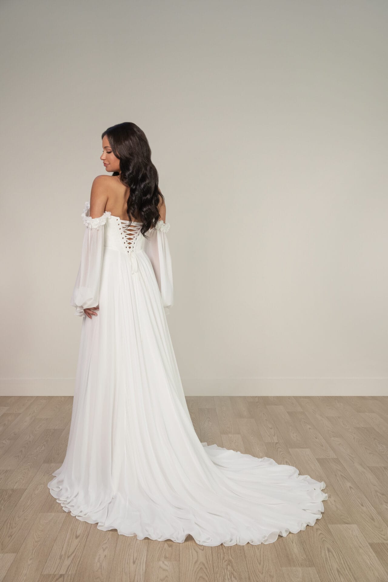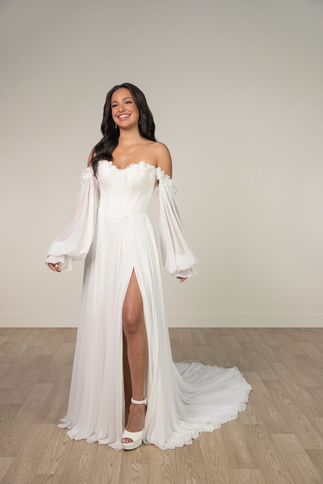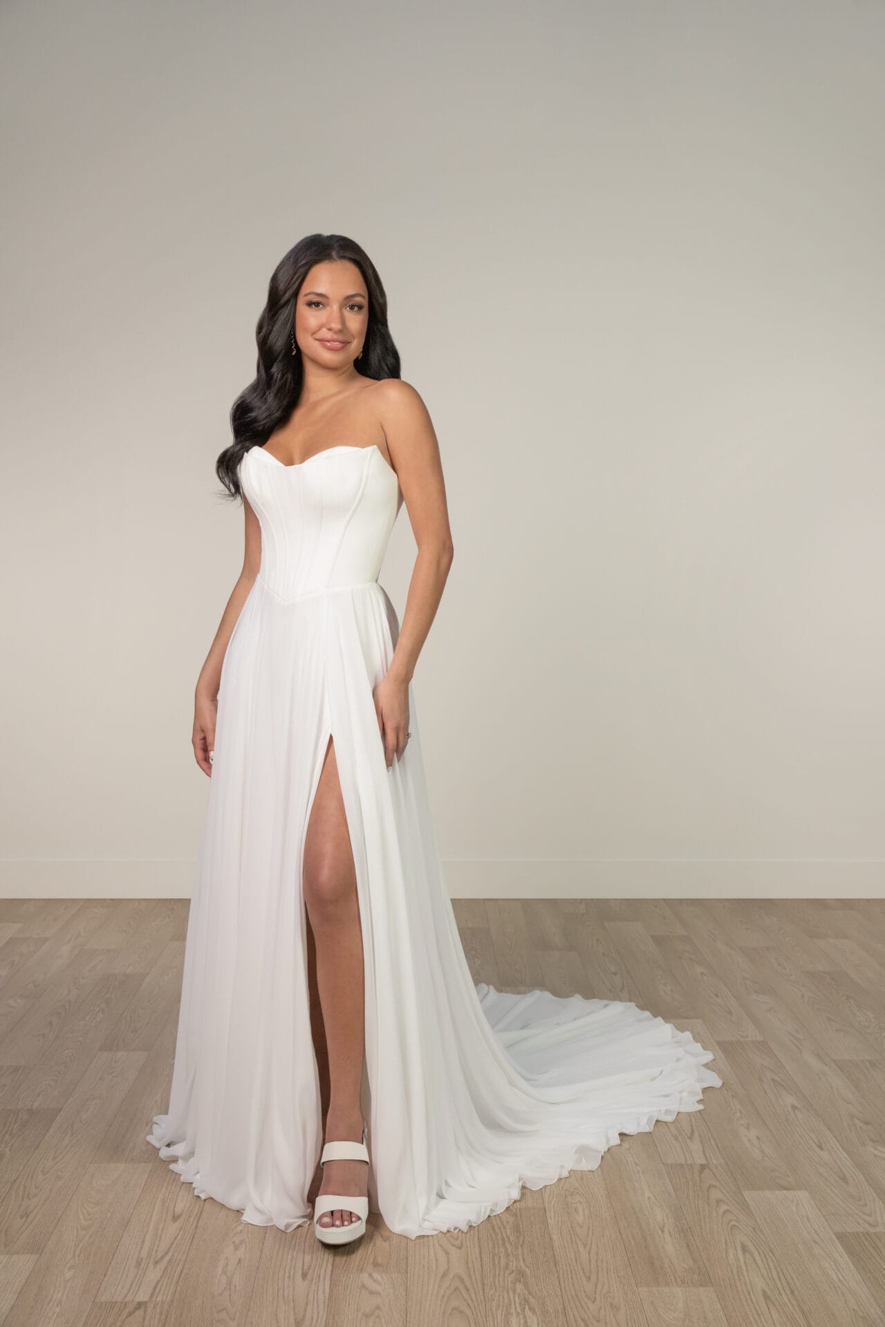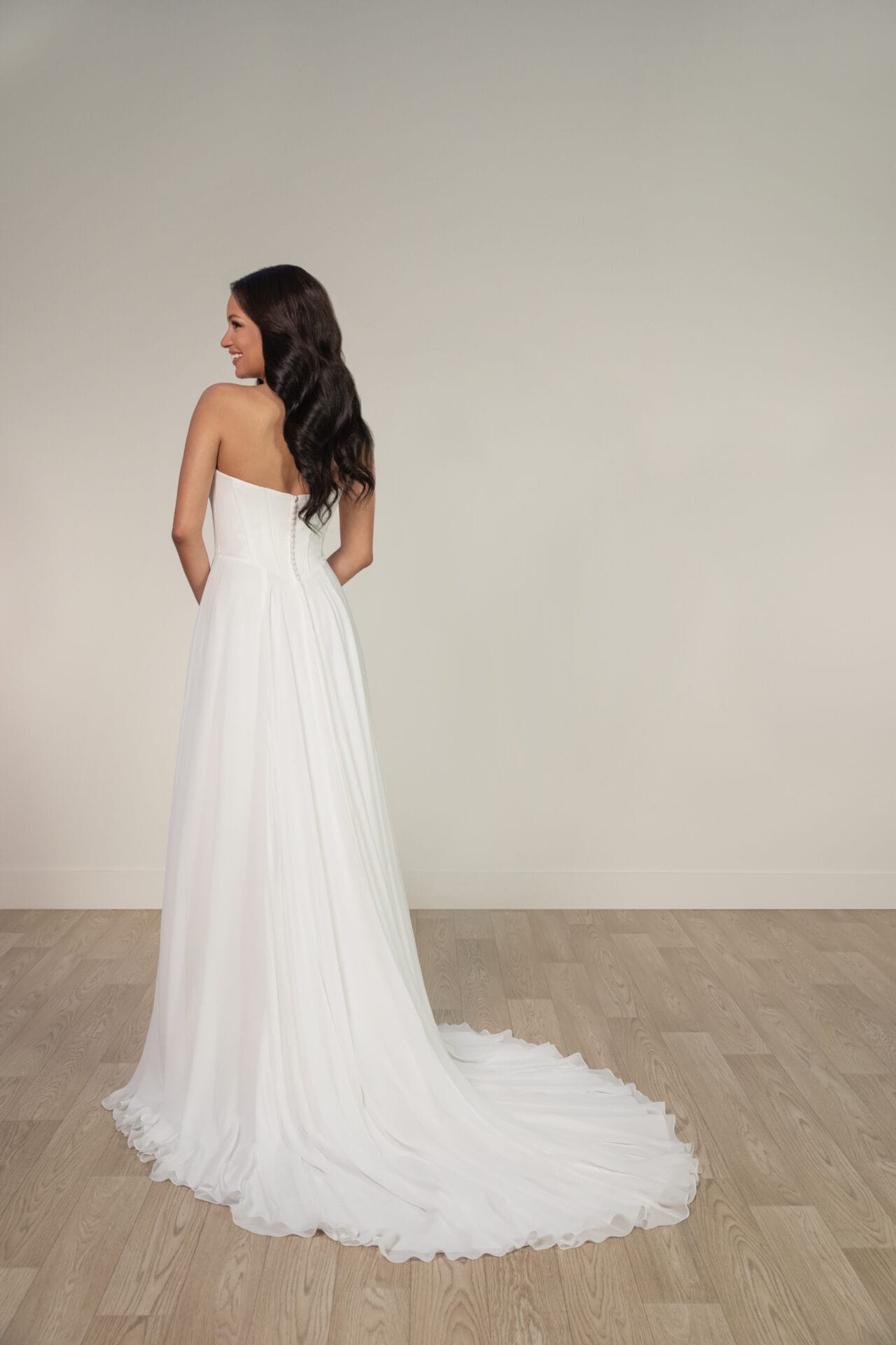 De SY8244 van Stella York is een elegante A-lijn jurk van soepelvallend chiffon met een zachte, romantische uitstraling. De strapless sweetheart halslijn en het korsetlijfje met basque waist zorgen voor een flatterend silhouet. De hoge split geeft de jurk een moderne twist, terwijl de sleep een klassieke touch toevoegt. Deze jurk is verkrijgbaar met of zonder 3D-bloemen op de halslijn. Deze jurk is bij ons te passen zonder mouwen. Dankzij de lichte stof en perfecte pasvorm is SY8244 ideaal voor elke bruid, ook verkrijgbaar in plussize.