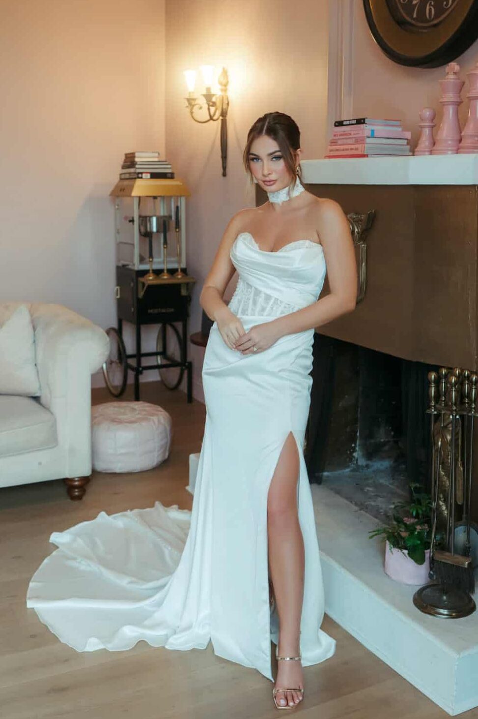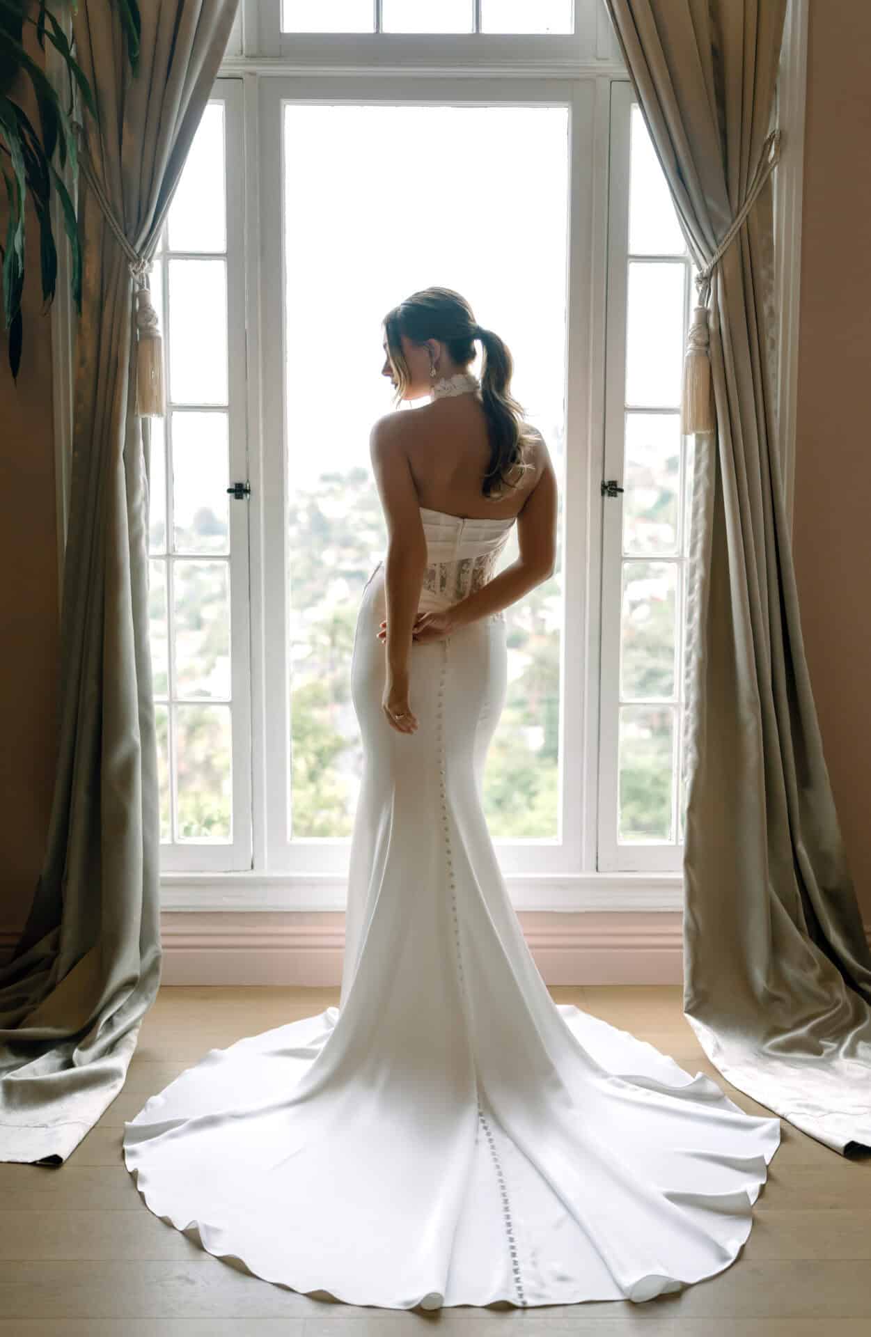 Deze Stella York trouwjurk, model SY8248, heeft een modern fit-and-flare silhouet van glad satijn. Het strapless lijfje vormt een gedrapeerde sweetheart halslijn, aangevuld met een asymmetrisch kanten detail voor een verfijnd accent. De rug sluit met satijnen knoopjes die doorlopen over de sleep, wat een klassiek effect geeft. De subtiele split aan de voorkant voegt een eigentijdse touch en extra bewegingsvrijheid toe. Deze jurk is een keuze voor bruiden die een stijlvolle, moderne uitstraling zoeken met zorgvuldig geplaatste details.