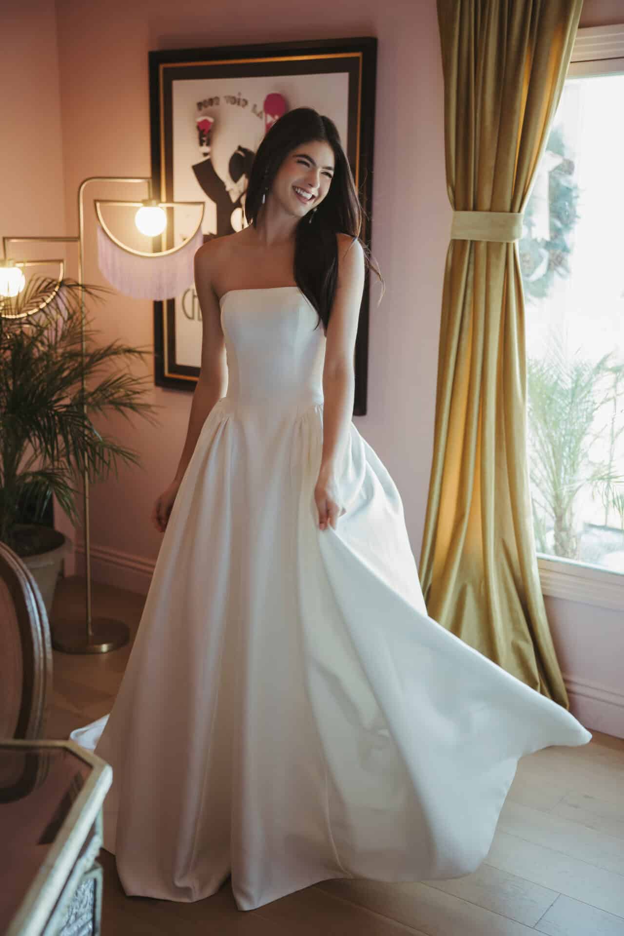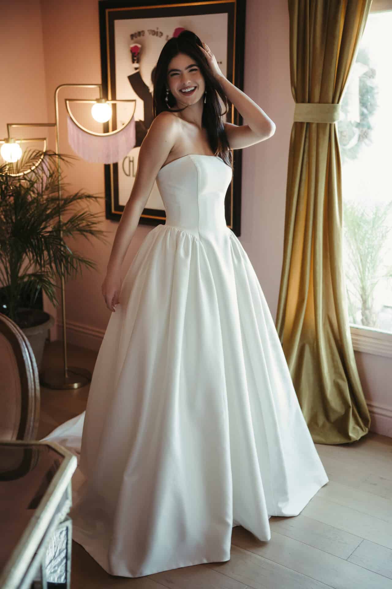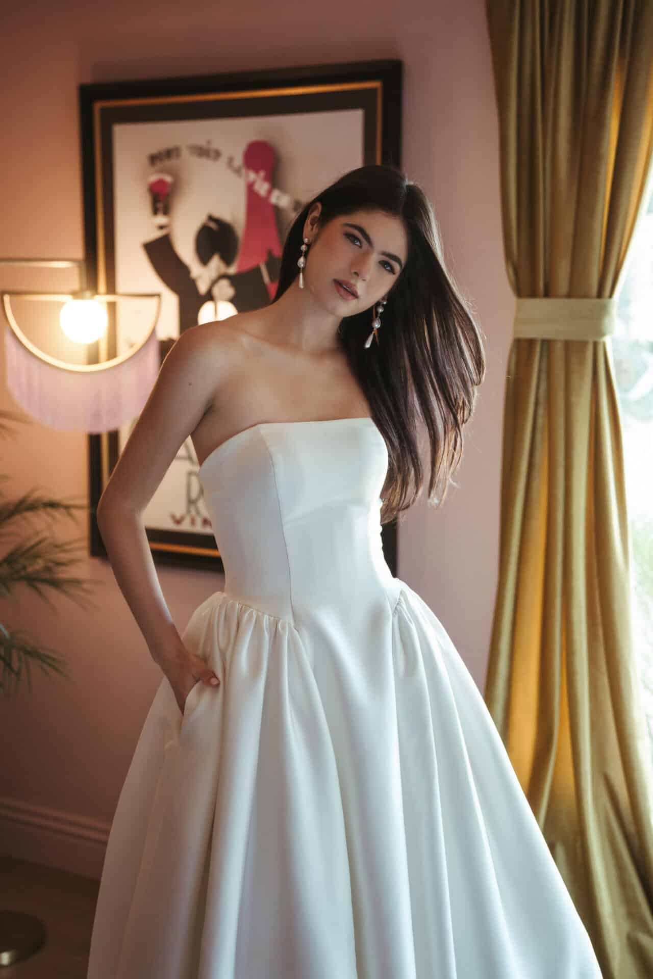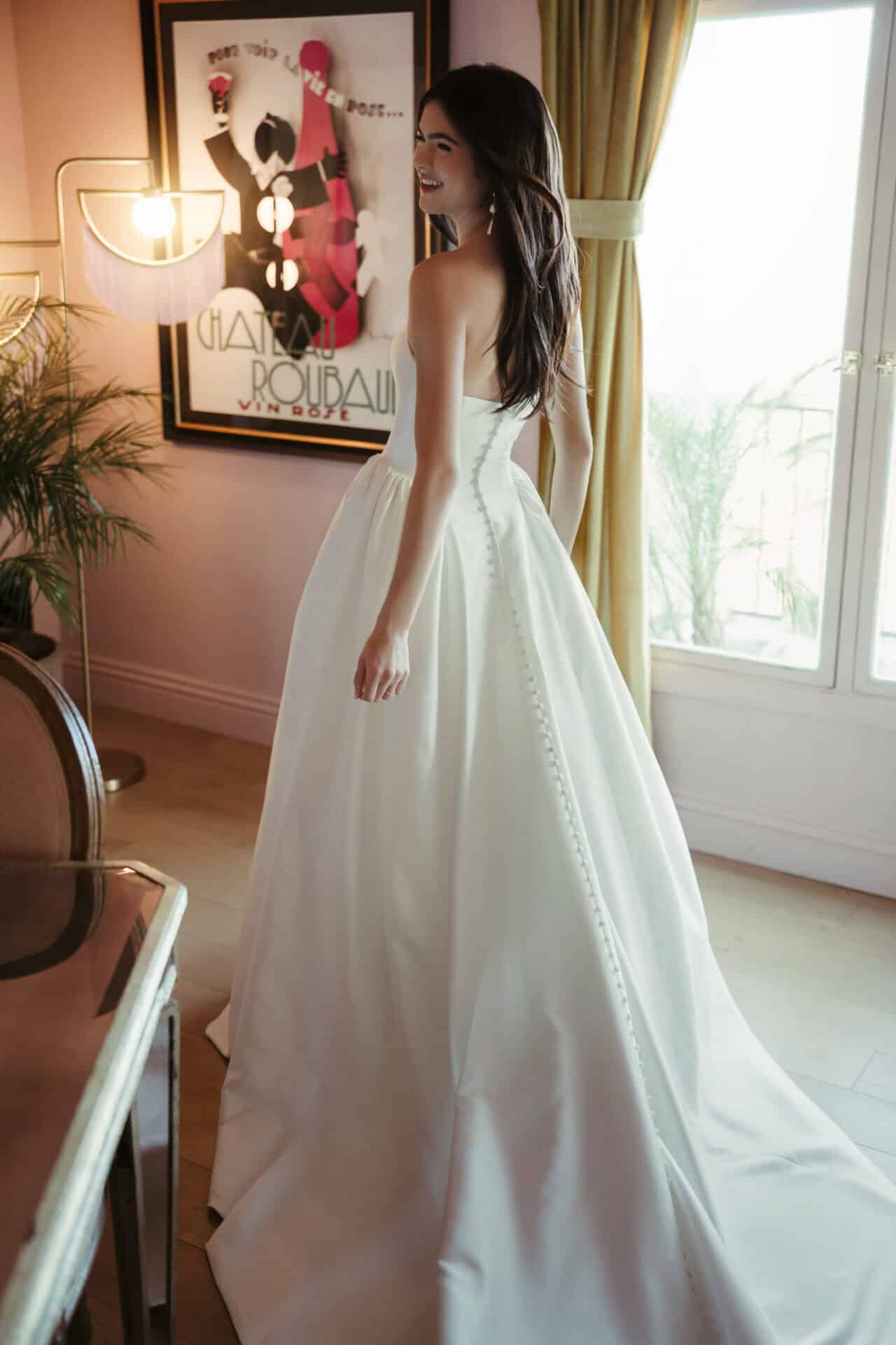 De jurk SY8274 van Stella York is een strapless prinsessenjurk van zacht satijn, met een rechte halslijn en een elegante basque waist. De fijne knoopjes lopen door tot over de sleep, die mooi achter je valt. In de rok zitten subtiel verwerkte steekzakken.