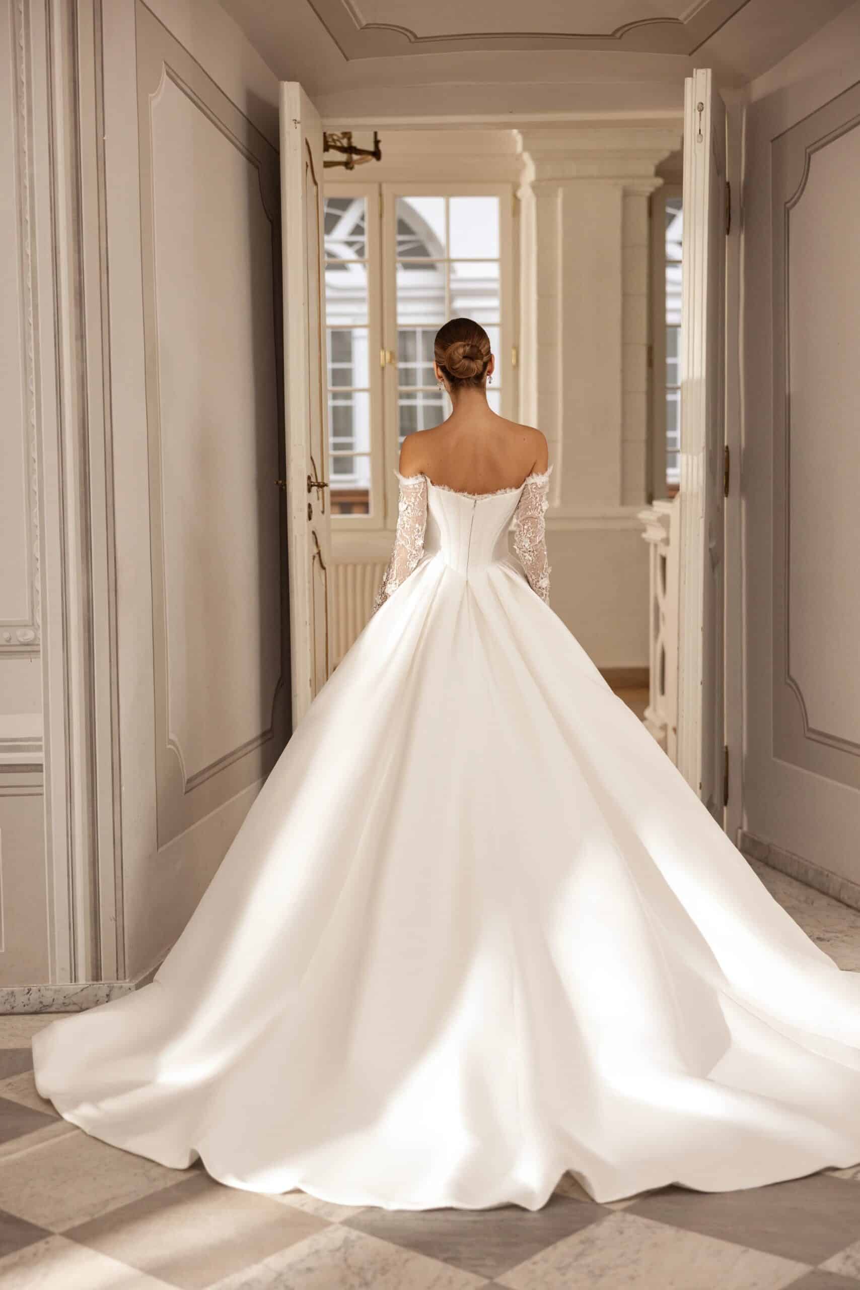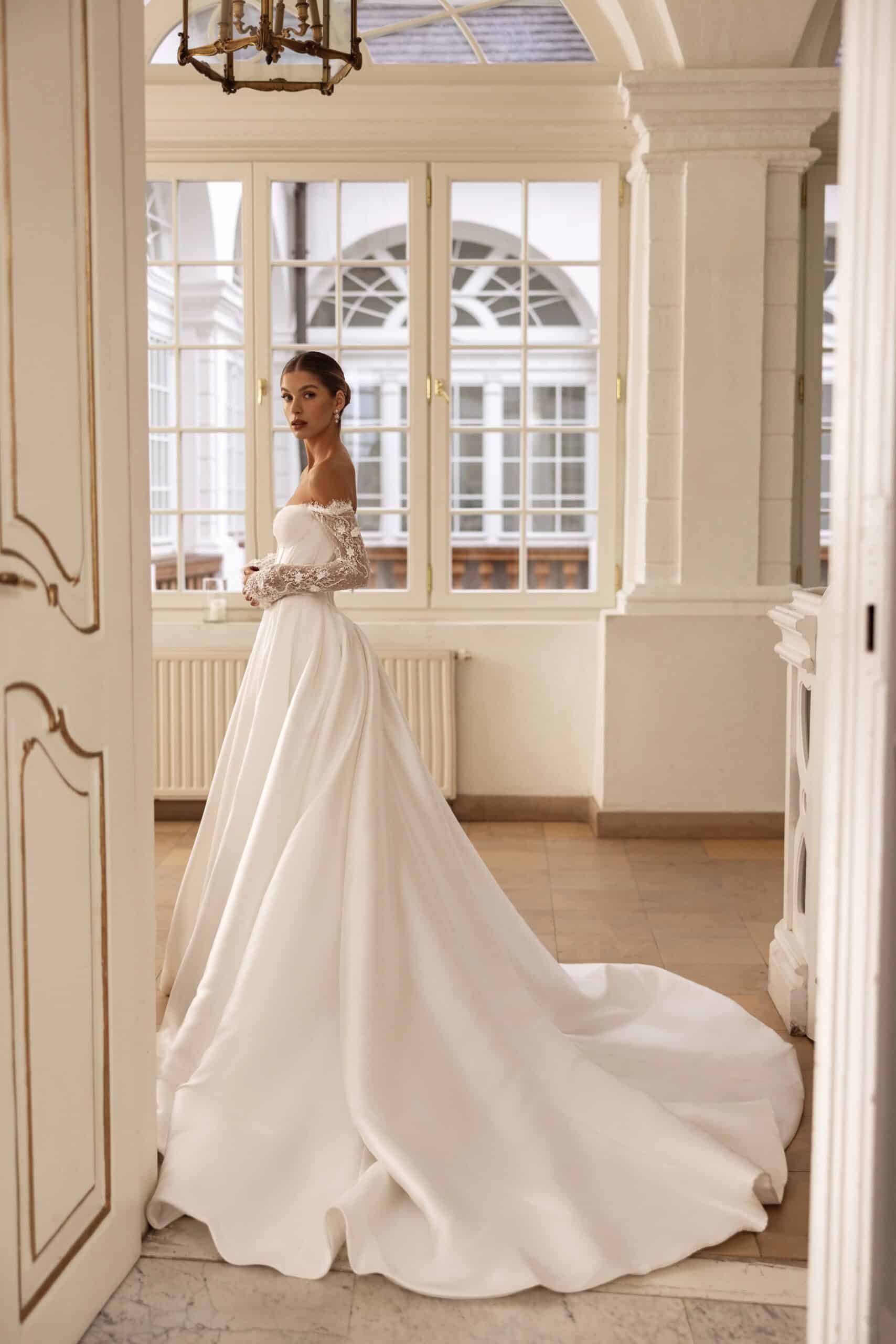 De trouwjurk Sybil van Tina Valerdi is een echte showstopper. Deze prinsessenjurk is gemaakt van stevig mikado en heeft een elegante off shoulder look met lange kanten mouwen. De top is corset-achtig en heeft een klassieke sweetheart halslijn die het bovenlijf mooi vormt. De rok is vol, maar strak gesneden en heeft een split aan de voorkant voor een moderne twist. De sleep maakt het geheel af. Een uitgesproken jurk voor de bruid die wil opvallen met stijl.