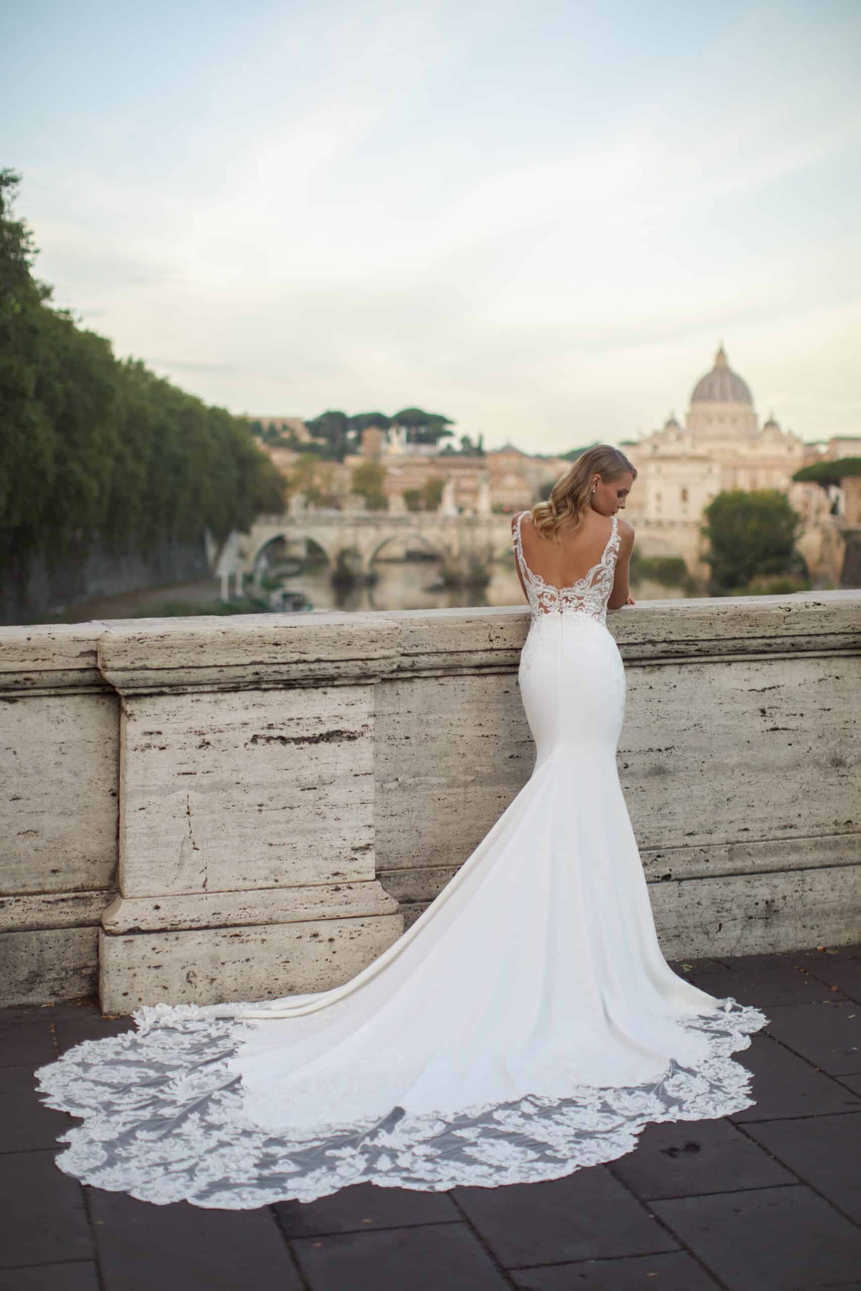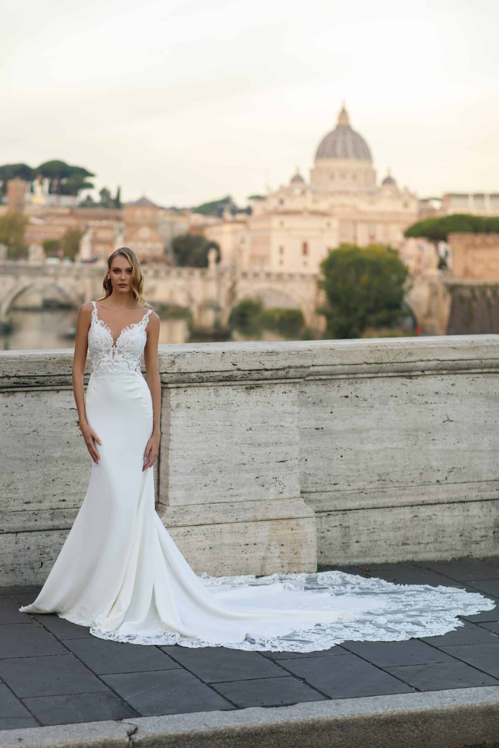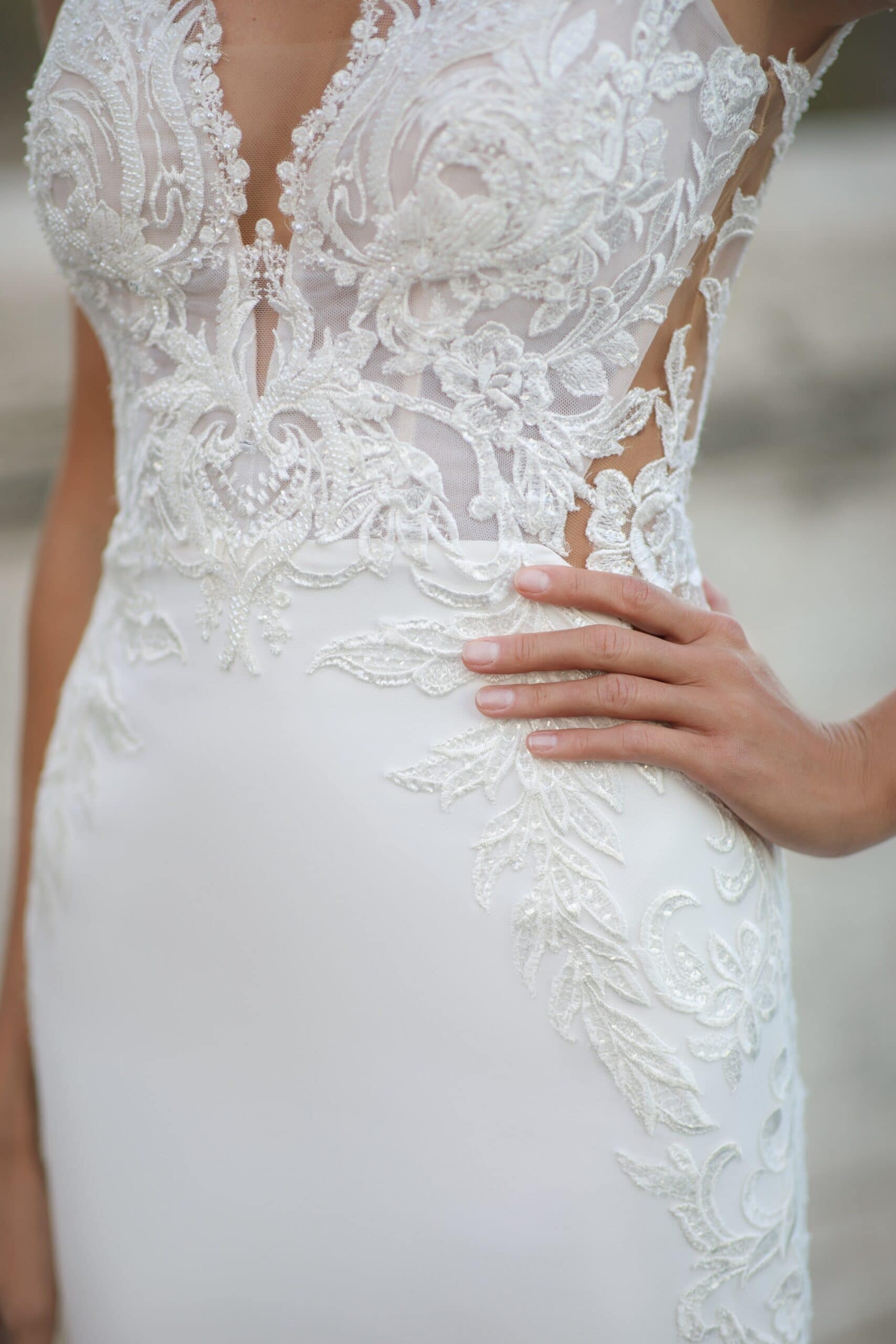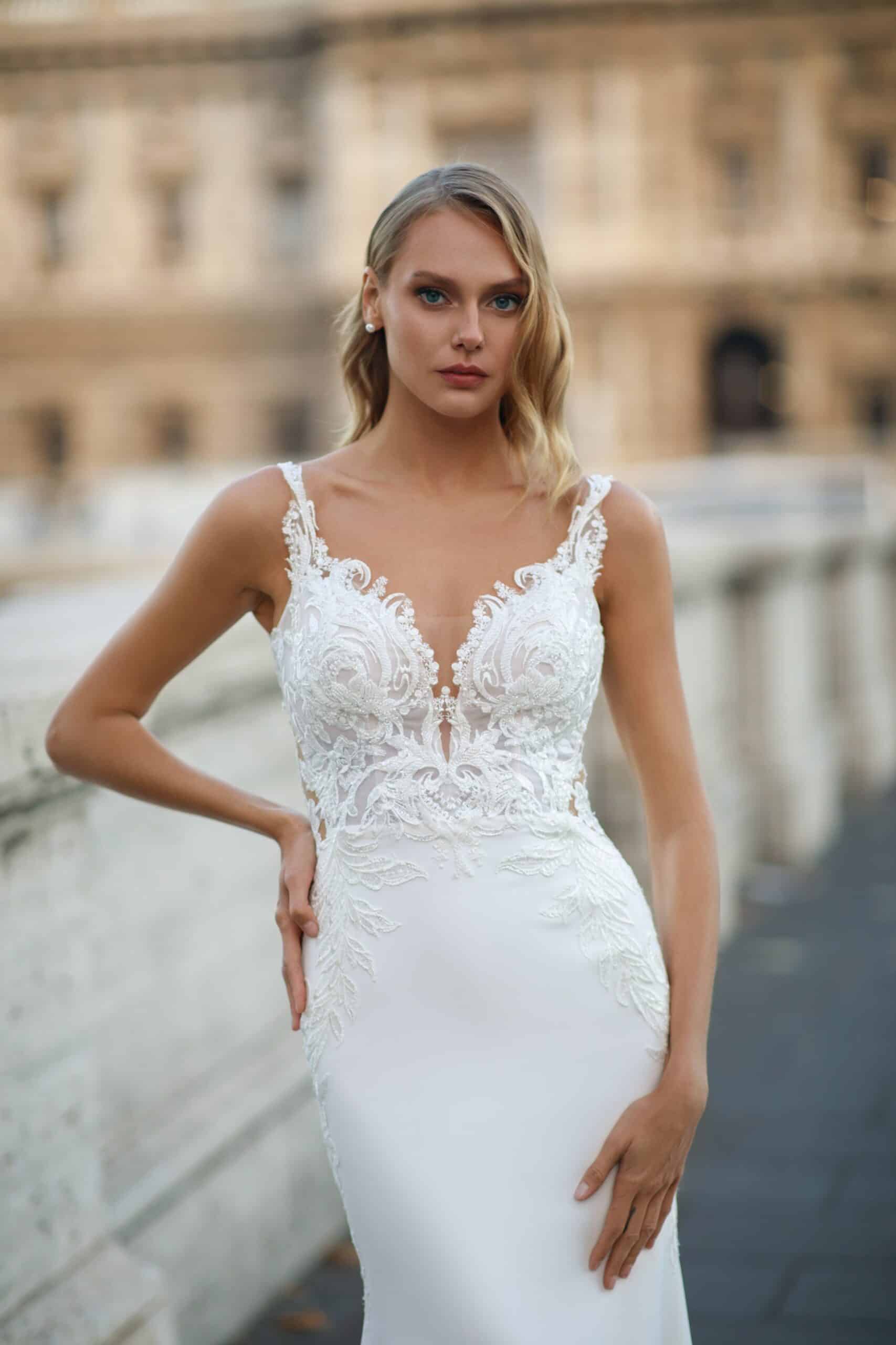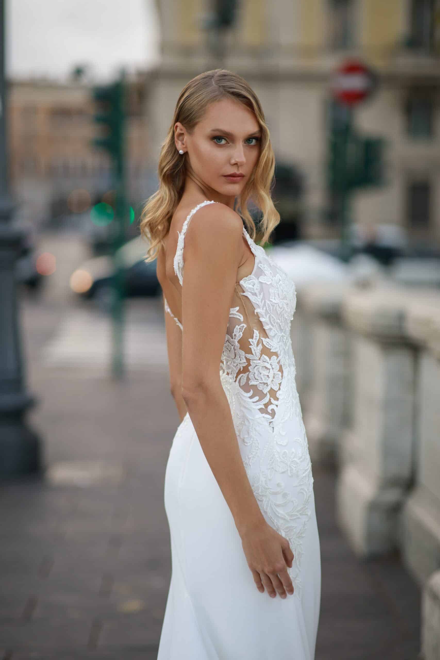 De jurk Erica van Yedyna is een jurk van crêpe en kant,met subtiele beading die het geheel een zachte glans geeft. De fijne schouderbandjes en V-hals geven vorm aan het bovenlijf, terwijl de cut-outs het ontwerp een luchtiger karakter geven. De mermaid pasvorm volgt het silhouet en gaat over in een kanten sleep die rustig achter je valt.