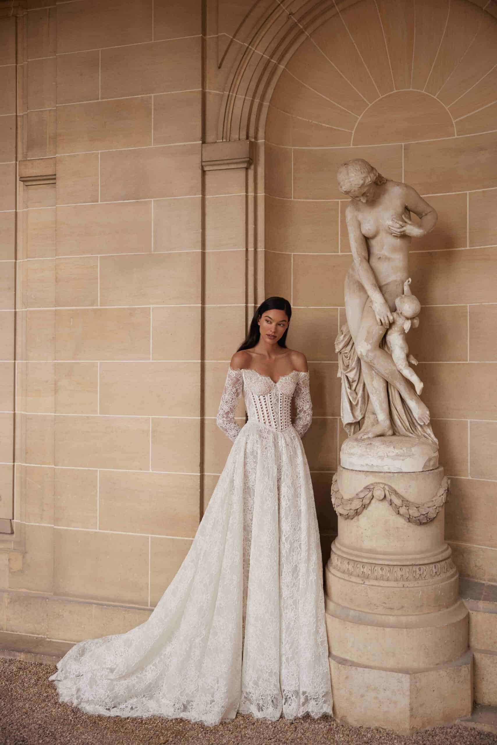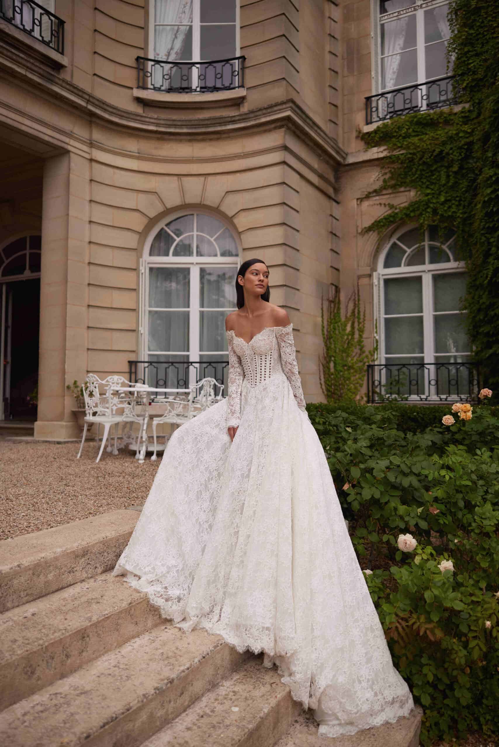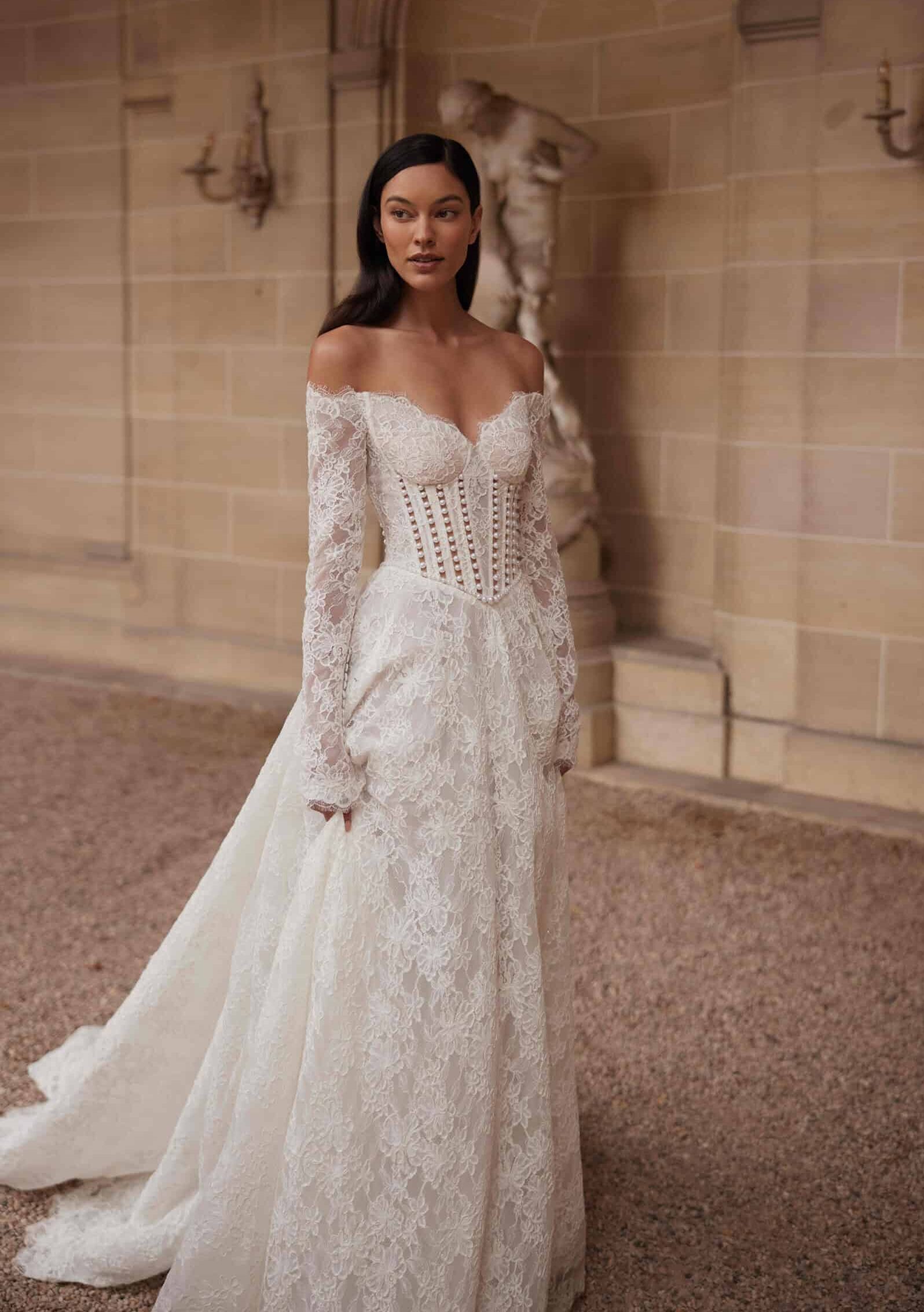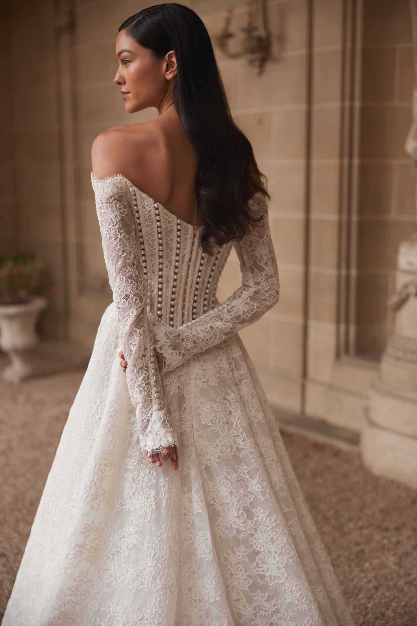 Vionne van Yedyna is een jurk van kant met een off-shoulder halslijn en een corset dat het bovenlijf zacht vormt. De basque waist valt laag en loopt over in een A-lijn die ruim en vloeiend naar beneden valt, eindigend in een lange sleep. De mouwen zijn lang en volledig van kant. In ons winkelmodel is het lijfje geheel van kant, zonder parels en zonder openingen, waardoor het ontwerp haar rustige karakter behoudt.
