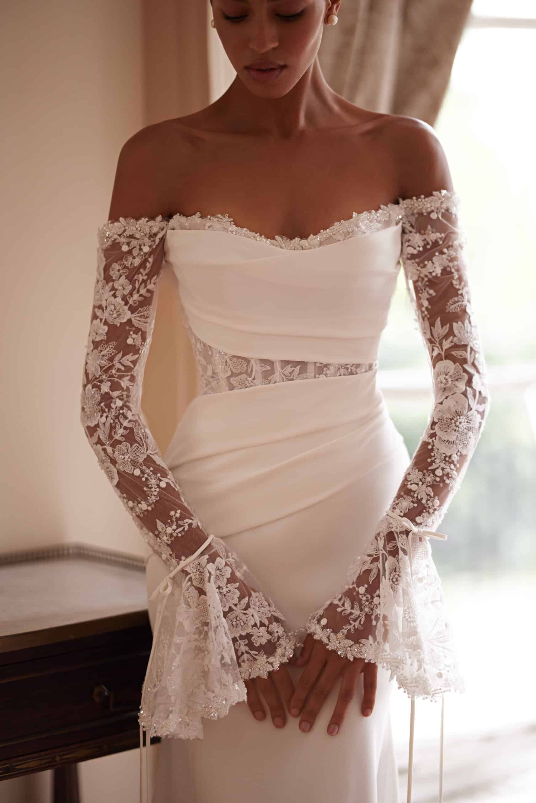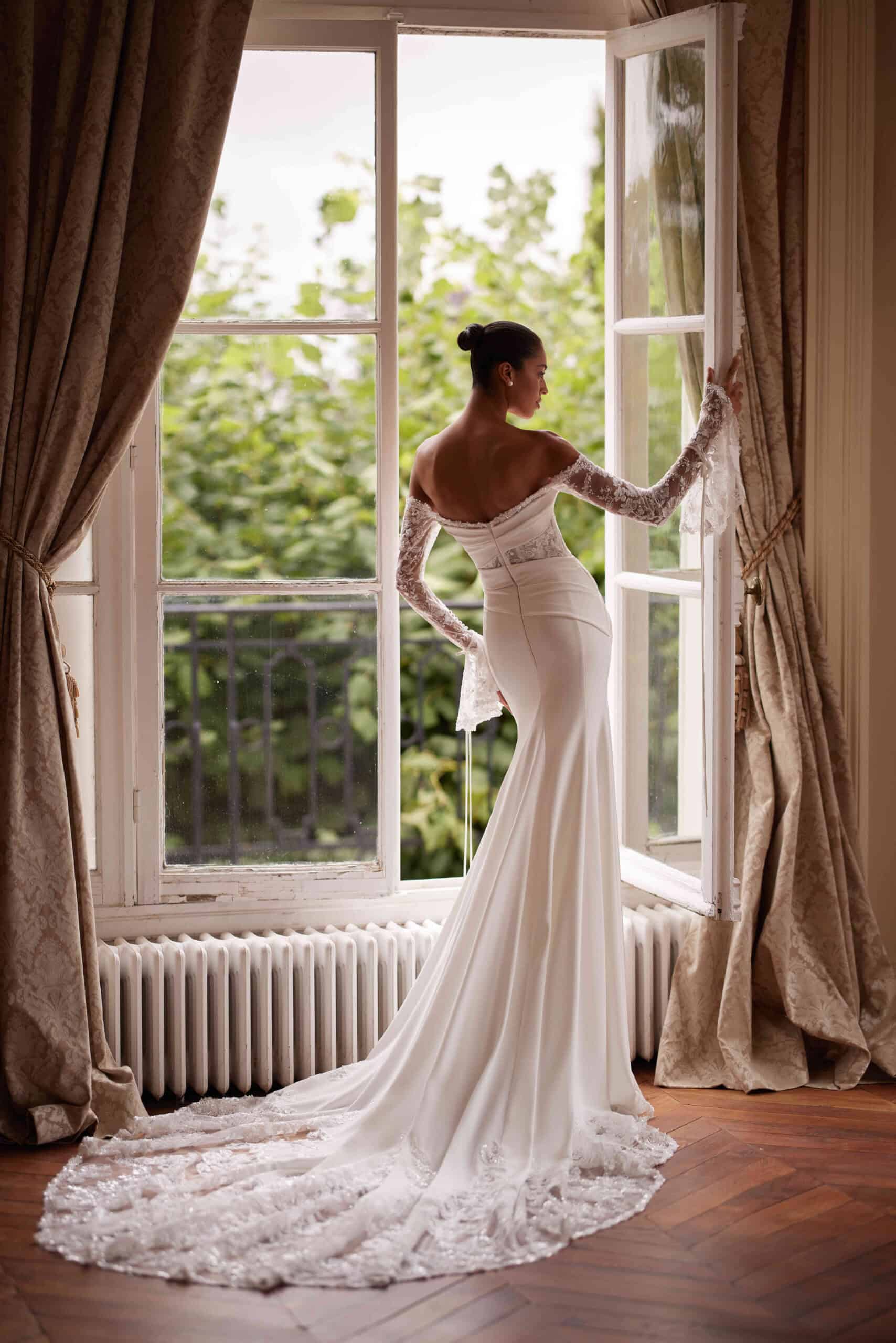 Josephine van Yedyna is een trouwjurk van kant en crêpe met lange mouwen en off-shoulder bandjes. Het asymmetrisch gedrapeerde lijfje volgt op een zachte manier de vormen van het lichaam en heeft een sweetheart halslijn. De jurk heeft een fit & flare silhouet dat vloeiend overgaat in de rok. Ons winkelmodel is uitgevoerd met een effen crêpe sleep zonder kant.